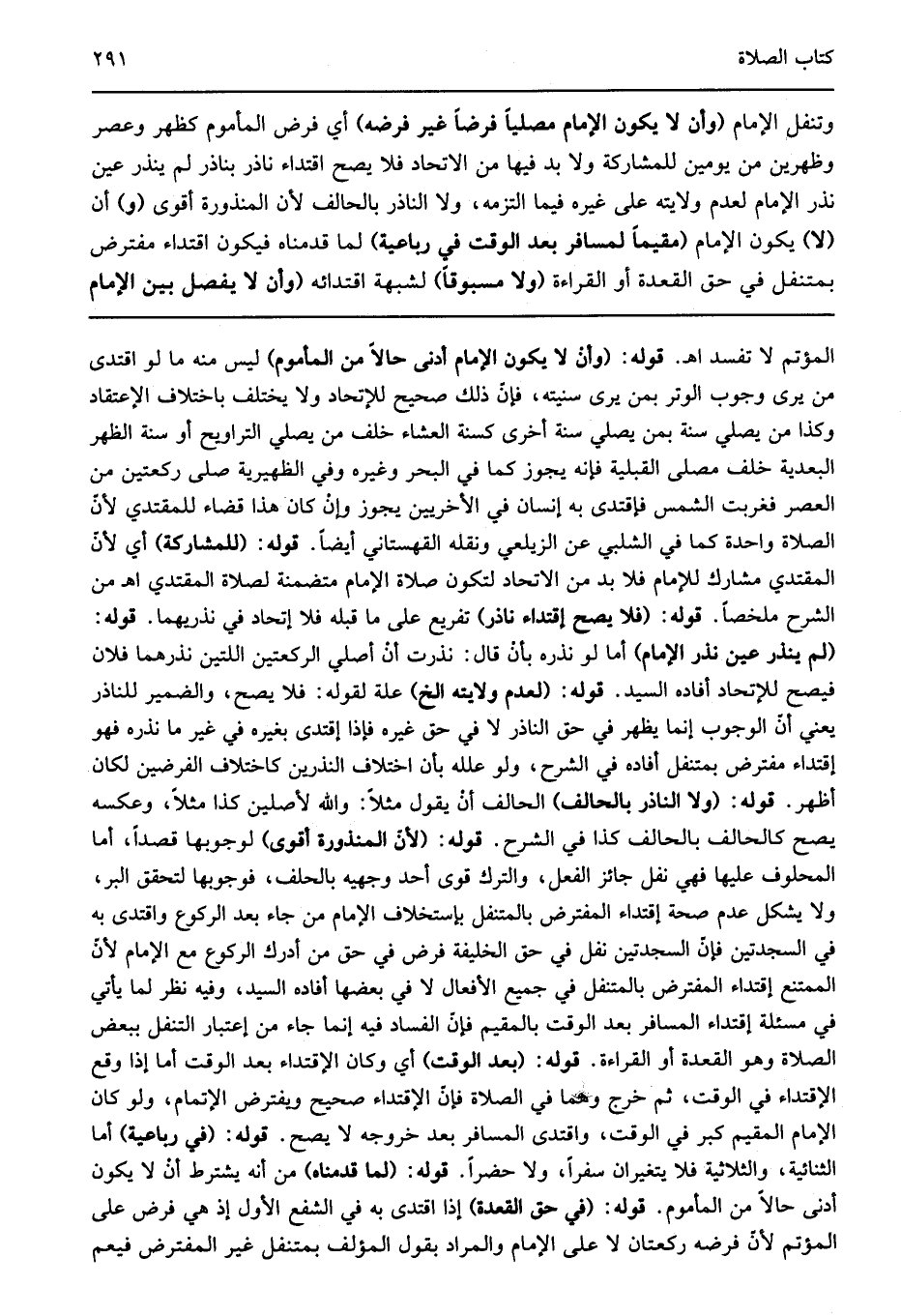 وتنفل الإمام "أن لا يكون الإمام مصليا فرضا غير فرضه" أي فرض المأموم كظهر وعصر وظهرين من يومين للمشاركة ولا بد فيها من الاتحاد فلا يصح اقتداء ناذر بناذر لم ينذر عين نذر الإمام لعدم ولايته على غيره فيما التزمه ولا الناذر بالحالف لأن المنذورة أقوى "و" أن "لا" يكون الإمام "مقيما لمسافر بعد الوقت في رباعية" لما قدمناه فيكون اقتداء مفترض بمتنفل في حق القعدة أو القراءة "ولا مسبوقا" لشبهة افتدائه "وأن لا يفصل بين الإمام