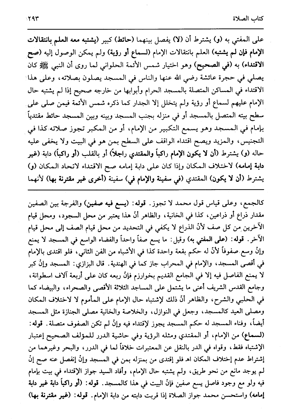 على المفتى به "و" يشترط أن "لا" يفصل بينهما "حائط" كبير "يشتبه معه العلم بانتقالات الإمام فإن لم يشتبه" العلم بانتقالات الإمام "لسماع أو رؤية" ولم يكن الوصول إليه "صح الاقتداء" به "في الصحيح" وهو اختيار شمس الأئمة الحلواني لما روى أن النبي صلى الله عليه وسلم كان يصلي في حجرة عائشة رضي الله عنها والناس في المسجد يصلون بصلاته وعلى هذا الافتداء في الأماكن المتصلة بالمسجد الحرام وأبوابها من خارجه صحيح إذا لم يشتبه حال الإمام عليهم بسماع أو رؤية ولم يتخلل إلا الجدار كما ذكره شمس الأئمة فيمن صلى على سطح بيته المتصل بالمسجد أو في منزله بجنب المسجد وبينه وبين المسجد حائط مقتديا بإمام في المسجد وهو يسمع التكبير من الإمام أو من المكبر تجوز صلاته كذا في الجنيس والمزيد ويصح اقتداء الواقف على السطح بمن هو في البيت ولا يخفى عليه حاله "و" يشترط "أن لا يكون الإمام راكبا والمقتدي راجلا" أو بالقلب "أو راكبا" دابة "غير دابة إمامه" لاختلاف المكان وإذا كان على دابة إمامه صح الاقتداء لاتحاد المكان "و" يشترط "أن لا يكون" المقتدي "في سفينة والإمام في" سفينة "أخرى غير مقترنة بها" لأنهما