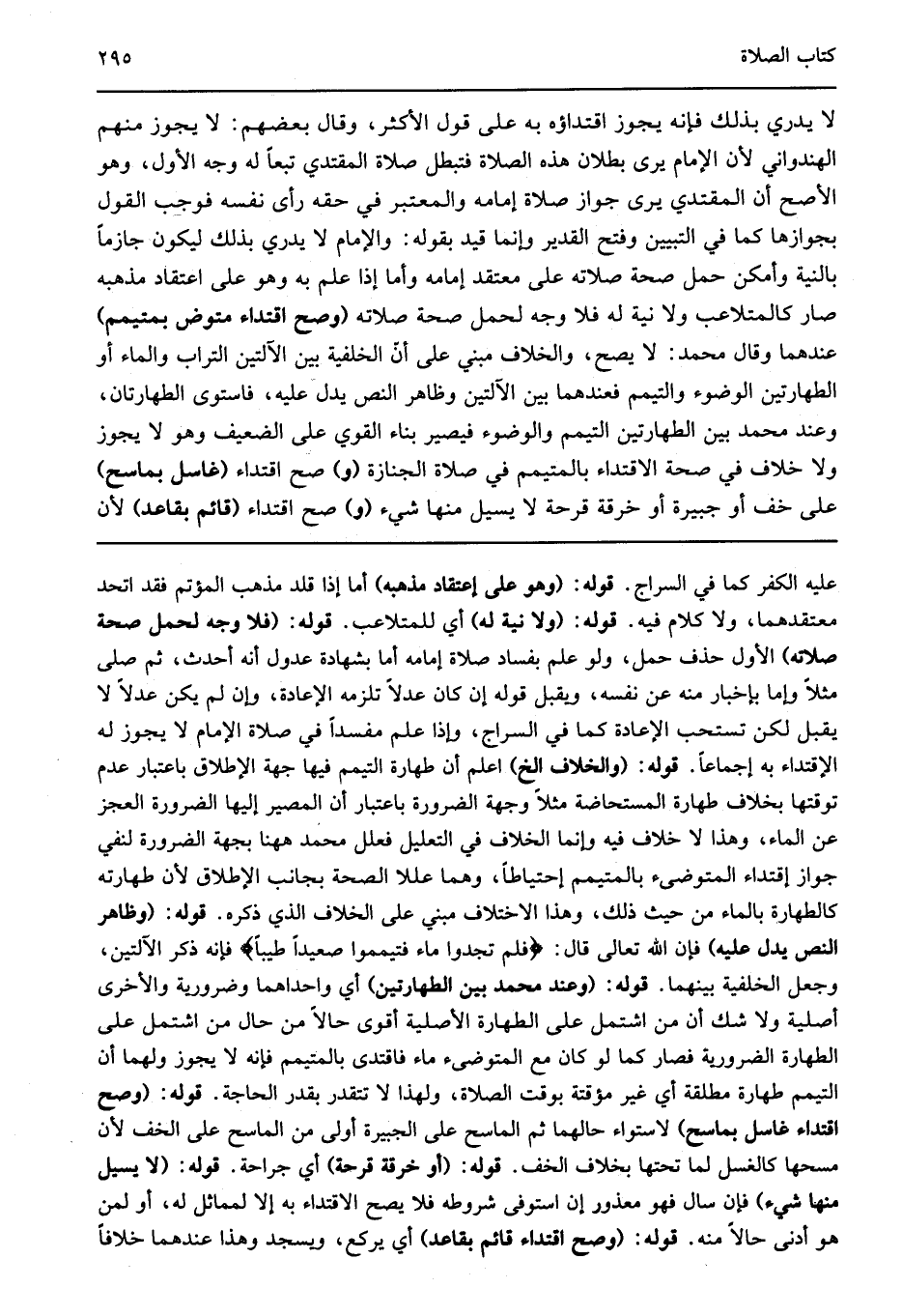 عليه الكفر كما في السراج قوله: "وهو على إعتقاد مذهبه" أما إذا قلد مذهب المؤتم فقد اتحد معتقدهما ولا كلام فيه قوله: "ولا نية له" أي للمتلاعب قوله: "فلا وجه لحمل صحة صلاته" الأول حذف حمل ولو علم بفساد صلاة إمامه أما بشهادة عدول أنه أحدث ثم صلى مثلا وإما بإخبار منه عن نفسه ويقبل قوله إن كان عدلا تلزمه الإعادة وإن لم يكن عدلا لا يقبل لكن تستحب الإعادة كما في السراج وإذا علم مفسدا في صلاة الإمام لا يجوز له الإقتداء به إجماعا قوله: "والخلاف الخ" اعلم ان طهارة التيمم فيها جهة الإطلاق باعتبار عدم توقتها بخلاف طهارة المستحاضة مثلا وجهة الضرورة باعتبار أن المصير إليها الضرورة العجز عن الماء وهذا لا خلاف فيه وإنما الخلاف في التعليل فعلل محمد ههنا بجهة الضرورة لنفي جواز إقتداء المتوضىء بالمتيمم إحتياطا وهما عللا الصحة بجانب الإطلاق لأن طهارته كالطهارة بالماء من حيث ذلك وهذا الاختلاف مبني على الخلاف الذي ذكره قوله: "وظاهر النص يدل عليه" فإن الله تعالى قال: {فَلَمْ تَجِدُوا مَاءً فَتَيَمَّمُوا صَعِيداً طَيِّباً} فإنه ذكر الآلتين وجعل الخلفية بينهما قوله: "وعند محمد بين الطهارتين" أي واحداهما وضرورية والأخرى أصلية ولا شك أن من اشتمل على الطهارة الأصلية أقوى حالا من حال من اشتمل على الطهارة الضرورية فصار كما لو كان مع المتوضىء ماء فاقتدى بالمتيمم فإنه لا يجوز ولهما أن التيمم طهارة مطلقة أي غير مؤقتة بوقت الصلاة ولهذا لا تتقدر بقدر الحاجة قوله: "وصح اقتداء غاسل بماسح" لاستواء حالهما ثم الماسح على الجبيرة أولى من الماسح على الخف لأن مسحها كالغسل لما تحتها بخلاف الخف قوله: "أو خرقة قرحة" أي جراحة قوله: "لا يسيل منها شيء" فإن سال فهو معذور إن استوفى شروطه فلا يصح الاقتداء به إلا لمماثل له أو لمن هو أدنى حالا منه قوله: "وصح اقتداء قائم بقاعد" أي يركع ويسجد وهذا عندهما خلافا