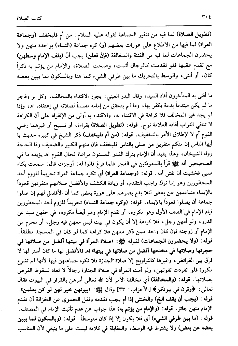 ما أفتى به المتأخرون أفاد السيد وقال البدر العيني يجوز الاقتداء بالمخالف وكل بر وفاجر ما لم يكن مبتدعا بدعة يكفر بها وما لم يتحقق من إمامه مفسدا لصلاته في إعتقاده اهـ وإذا لم يجد غير المخالف فلا كراهة في الاقتداء به والاقتداء به أولى من الإنفراد على أن الكراهة لا تنافي الثواب أفاده العلامة نوح قوله: "تطويل الصلاة" بقراءة أو تسبيح أو غيرهما رضي القوم أم لا لإطلاق الأمر بالتخفيف قوله: "من أم فليخفف" ذكر الشيخ في كبيره حديث يا أيها الناس إن منكم منفرين من صلى بالناس فليخفف فإن منهم الكبير والضعيف وذا الحاجة رواه الشيخان وهذا يفيد أن الإمام يترك القدر المسنون مراعاة لحال القوم اهـ يؤيده ما في الصحيحين أنه صلى الله عليه وسلم قرأ بالمعوذتين في الفجر فلما فرغ قالوا: له أوجزت قال سمعت بكاء صبي فخشيت أن تفتن أمه قوله: "وجماعة العراة" أي تكره جماعة العراة تحريما للزوم أحد المحظورين وهو إما ترك واجب التقدم أو زيادة الكشف والأفضل صلاتهم منفردين قعودا بالإيماء متباعدين عن بعض لئلا يقع بصرهم على عورة بعض كما أن الأفضل لهم إن صلوا جماعة أن يصلوا قعودا بالإيماء قوله: "وكره جماعة النساء" تحريما للزوم أحد المحظورين قيام الإمام في الصف الأول وهو مكروه أو تقدم الإمام وهو أيضا مكروه في حقهن سيد عن الدرر ولو أمهن رجل فلا كراهة إلا أن يكون في بيت ليس معهن فيه رجل أو محرم من الإمام أو زوجته فإن كان واحد ممن ذكر معهن فلا كراهة كما لو كان في المسجد مطلقا قوله: "ولا يحضرون الجماعات" لقوله صلى الله عليه وسلم: "صلاة المرأة في بيتها أفضل من صلاتها في حجرتها وصلاتها في مخدعها أفضل من صلاتها في بيتها" اهـ فالأفضل لها ما كان أستر لها لا فرق بين الفرائض وغيرها كالتراويح إلا صلاة الجنازة فلا تكره جماعتهن فيها لأنها لم تشرع مكررة فلو انفردت تفوتهن ولو أمت المرأة في صلاة الجنازة رجالا لا تعاد لسقوط الفرض بصلاتها قوله: "والمخالفة" أي مخالفة الأمر لأن الله تعالى أمرهن بالقرار في البيوت فقال تعالى: {وَقَرْنَ فِي بُيُوتِكُنَّ} [الأحزاب: 33] وقال صلى الله عليه وسلم: "بيوتهن خير لهن لو كن يعلمن" قوله: "يجب أن يقف الخ" والخنثى إذا أم يجب تقدمه ونقل الحموي عن الخزانة أن تقدم الإمام منهن جائز قوله: "والإمام من يؤتم به" هذا جواب عن عدم تأنيث الإمام في المصنف قوله: "ما بين طرفي الشيء" أي فلا يكون إلا إذا كان متوسطا قوله: "وبالسكون لما يبين بعضه عن بعض" ولا يشترط فيه الوسط والمقابلة في كلامه ليست على ما ينبغي لأن المناسب