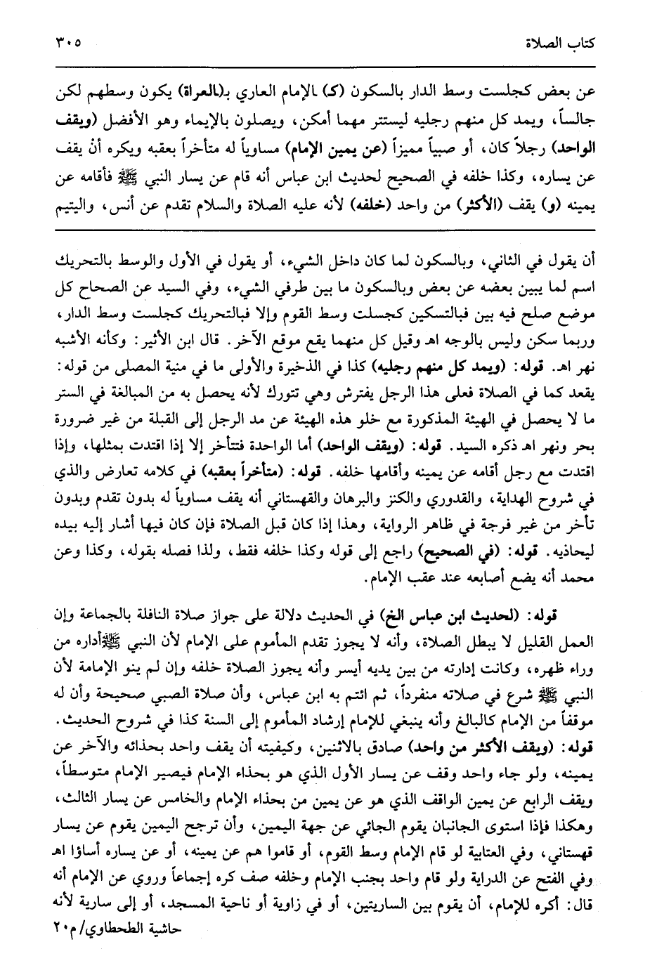 عن بعض كجلست وسط الدار بالسكون "ك" الإمام العاري "العراة" يكون وسطهم لكن جالسا ويمد كل منهم رجليه ليستتر مهما أمكن ويصلون بإيماء وهو الأفضل "ويقف الواحد" رجلا أو صبيا مميزا "عن يمين الإمام" مساويا له متأخرا بعقبه ويكره أن يقف عن يساره وكذا خلفه في الصحيح لحديث ابن عباس أنه قام عن يسار النبي صلى الله عليه وسلم فأقامه عن يمينه "و" يقف "الأكثر" من واحد "خلفه" لأنه عليه الصلاة والسلام تقدم عن أنس واليتيم