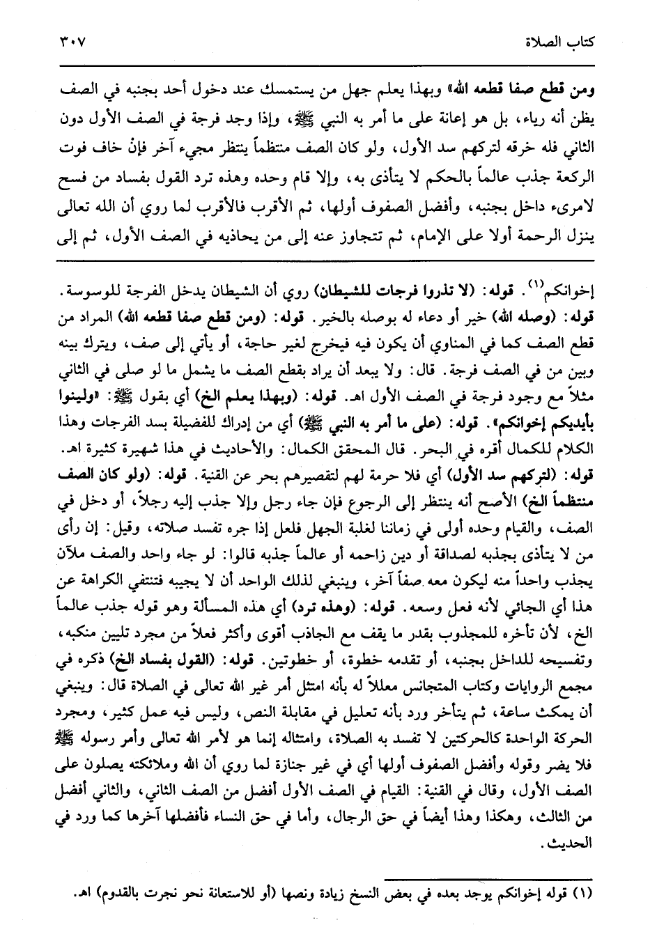 إخوانكم1 قوله: "لا تذروا فرجات للشيطان" روي ان الشيطان يدخل الفرجة للوسوسة قوله: "وصله الله" خير أو دعاء له بوصله بالخير قوله: "ومن قطع صفا قطعه الله" المراد من قطع الصف كما في المناوي أن يكون فيه فيخرج لغير حاجة أو يأتي إلى صف ويترك بينه وبين من في الصف فرجة قال ولا يبعد أن يراد بقطع الصف ما يشمل ما لو صلى في الثاني مثلا مع وجود فرجة في الصف الأول اهـ قوله: "وبهذا يعلم الخ" أي بقول صلى الله عليه وسلم: "ولينوا بأيديكم إخوانكم" قوله: "على ما أمر به النبي صلى الله عليه وسلم" أي من إدراك للفضيلة بسد الفرجات وهذا الكلام للكمال أقره في البحر قال المحقق الكمال والأحاديث في هذا شهيرة كثيرة اهـ قوله: "لتركهم سد الأول" أي فلا حرمة لهم لتقصيرهم بحر عن القنية قوله: "ولو كان الصف منتظما الخ" الأصح أنه ينتظر إلى الرجوع فإن جاء رجل وإلا جذب إليه رجلا أو دخل في الصف والقيام وحده أولى في زماننا لغلبة الجهل فلعل إذا جره تفسد صلاته وقيل إن رأى من لا يتأذى بجذبه لصداقة أو دين زاحمه أو عالما جذبه قالوا: لو جاء واحد والصف ملآن يجذب واحدا منه ليكون معه صفا آخر وينبغي لذلك الواحد أن لا يجيبه فتنتفي الكراهة عن هذا أي الجائي لأنه فعل وسعه قوله: "وهذه ترد" أي هذه المسألة وهو قوله جذب عالما الخ لأن تأخره للمجذوب بقدر ما يقف مع الجاذب أقوى وأكثر فعلا من مجرد تليين منكبه وتفسيحه للداخل بجنبه أو تقدمه خطوة أو خطوتين قوله: "القول بفساد الخ" ذكره في مجمع الروايات وكتاب المتجانس معللا له بأنه امتثل أمر غير الله تعالى في الصلاة قال وينبغي أن يمكث ساعة ثم يتأخر ورد بأنه تعليل في مقابلة النص وليس فيه عمل كثير ومجرد الحركة الواحدة كالحركتين لا تفسد به الصلاة وامتثاله إنما هو لأمر الله تعالى وأمر رسوله صلى الله عليه وسلم فلا يضر وقوله وأفضل الصفوف أولها أي في غير جنازة لما روي أن الله وملائكته يصلون على الصف الأول وقال في القنية القيام في الصف الأول أفضل من الصف الثاني والثاني أفضل من الثالث وهكذا وهذا أيضا في حق الرجال وأما في حق النساء فأفضلها آخرها كما ورد في الحديث