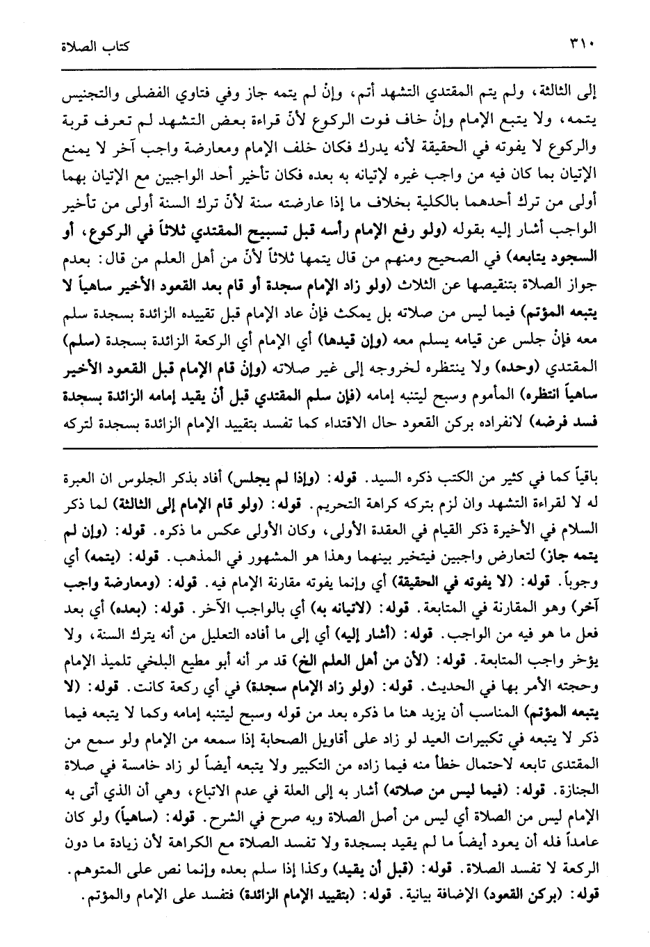 باقيا كما في كثير من الكتب ذكره السيد قوله: "وإذا لم يجلس" أفاد بذكر الجلوس ان العبرة له لا لقراءة التشهد وان لزم بتركه كراهة التحريم قوله: "ولو قام الإمام إلى الثالثة" لما ذكر السلام في الأخيرة ذكر القيام في العقدة الأولى وكان الأولى عكس ما ذكره قوله: "وإن لم يتمه جاز" لتعارض واجبين فمتخير بينهما وهذا هو المشهور في المذهب قوله: "يتمه" أي وجوبا قوله: "لا يفوته في الحقيقة" أي وإنما يفوته مقارنة الإمام فيه قوله: "ومعارضة واجب آخر" وهو المقارنة في المتابعة قوله: "لاتيانه به" أي بالواجب الآخر قوله: "بعده" أي بعد فعل ما هو فيه من الواجب قوله: "أشار إليه" أي إلى ما أفاده التعليل من أنه يترك السنة ولا يؤخر واجب المتابعة قوله: "لأن من أهل العلم الخ" قد مر أنه أبو مطيع البلخي تلميذ الإمام وحجته الأمر بها في الحديث قوله: "ولو زاد الإمام سجدة" في أي ركعة كانت قوله: "لا يتبعه المؤتم" المناسب أن يزيد هنا ما ذكره بعد من قوله وسبح ليتنبه إمامه وكما لا يتبعه فيما ذكر لا يتبعه في تكبيرات العيد لو زاد على أقاويل الصحابة إذا سمعه من الإمام ولو سمع من المقتدى تابعه لاحتمال خطأ منه فيما زاده من التكبير ولا يتبعه أيضا لو زاد خامسة في صلاة الجنازة قوله: "فيما ليس من صلاته" أشار به إلى العلة في عدم الاتباع وهي أن الذي أتى به الإمام ليس من الصلاة أي ليس من أصل الصلاة وبه صرح في الشرح قوله: "ساهيا" ولو كان عامدا فله أن يعود أيضا ما لم يقيد بسجدة ولا تفسد الصلاة مع الكراهة لأن زيادة ما دون الركعة لا تفسد الصلاة قوله: "قبل أن يقيد" وكذا إذا سلم بعده وإنما نص على المتوهم قوله: "بركن القعود" الإضافة بيانية قوله: "بتقييد الإمام الزائدة" فتفسد على الإمام والمؤتم