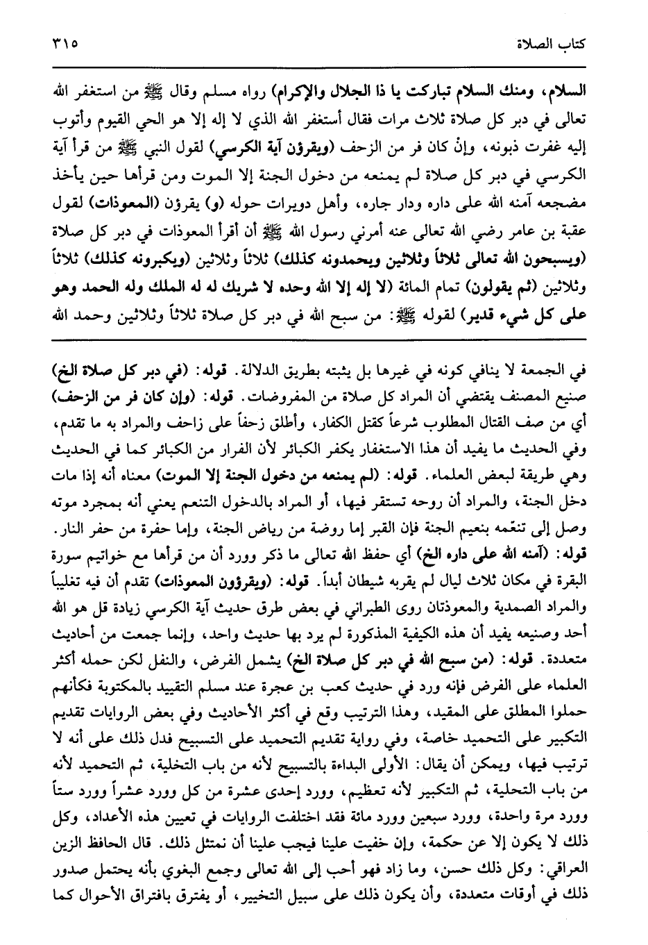 السلام ومنك السلام تباركت يا ذا الجلال والإكرام" رواه مسلم وقال صلى الله عليه وسلم: " من استغفر الله تعالى في دبر كل صلاة ثلاث مرات فقال: أستغفر الله الذي لا إله إلا هو الحي القيوم وأتوب إليه غفرت ذنوبه وإن كان فر من الزحف" "ويقرؤون آية الكرسي" من قرأ آية الكرسي في دبر كل صلاة لم يمنعه من دخول الجنة إلا الموت ومن قرأها حين يأخذ مضجعه آمنه الله على داره ودار جاره وأهل دويرات حوله "و" يقرؤون "المعوذات" لقول عقبة بن عامر رضي الله تعالى عنه أمرني رسول الله صلى الله عليه وسلم أن أقرأ المعوذات في دبر كل صلاة "ويسبحون الله ثلاثا وثلاثين ويحمدونه كذلك" ثلاثا وثلاثين "ويكبرونه كذلك" ثلاثا وثلاثين "ثم يقولون" تمام المائة "لا إله إلا الله وحده لا شريك له له الملك وله الحمد وهو على كل شيء قدير" لقوله صلى الله عليه وسلم: "من سبح الله في دبر كل صلاة ثلاثا وثلاثين وحمد الله