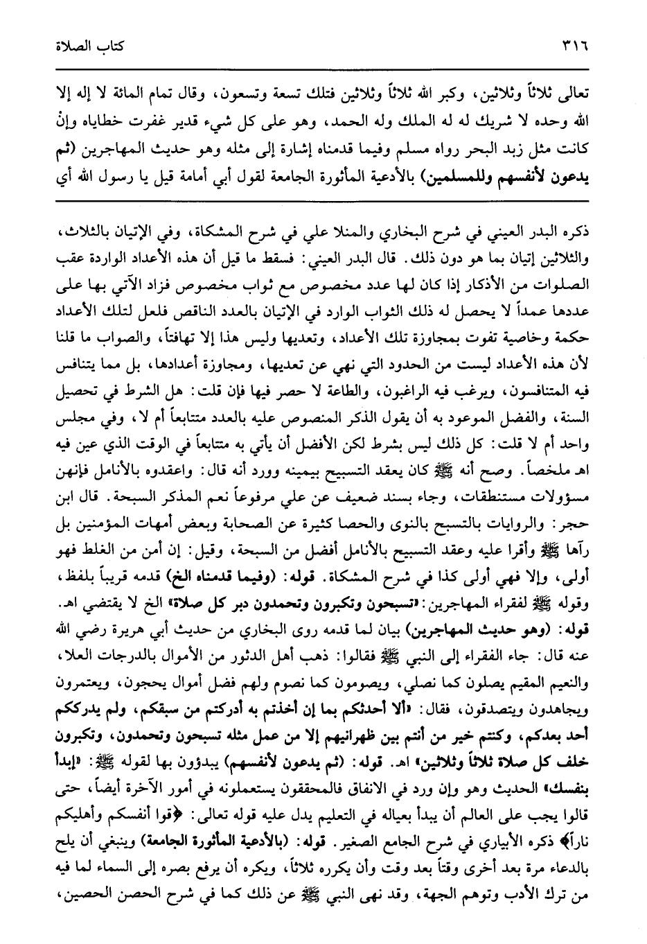 ذكره البدر العيني في شرح البخاري والمنلا علي في شرح المشكاة وفي الإتيان بالثلاث والثلاثين إتيان بما هو دون ذلك قال البدر العيني فسقط ما قيل ان هذه الأعداد الواردة عقب الصلوات من الأذكار إذا كان لها عدد مخصوص مع ثواب مخصوص فزاد الآتي بها على عددها عمدا لا يحصل له ذلك الثواب الوارد في الإتيان بالعدد الناقص فلعل لتلك الأعداد حكمة وخاصية تفوت بمجاوزة تلك الأعداد وتعديها وليس هذا إلا تهافتا والصواب ما قلنا لأن هذه الأعداد ليست من الحدود التي نهي عن تعديها ومجاوزة أعدادها بل مما يتنافس فيه المتنافسون ويرغب فيه الراغبون والطاعة لا حصر فيها فإن قلت هل الشرط في تحصيل السنة والفضل الموعود به أن يقول الذكر المنصوص عليه بالعدد متتابعا أم لا وفي مجلس واحد أم لا قلت كل ذلك ليس بشرط لكن الأفضل أن يأتي به متتابعا في الوقت الذي عين فيه اهـ ملخصا وصح أنه صلى الله عليه وسلم كان يعقد التسبيح بيمينه وورد أنه قال واعقدوه بالأنامل فإنهن مسؤولات مستنطقات وجاء بسند ضعيف عن علي مرفوعا نعم المذكر السبحة قالابن حجر والروايات بالتسبح بالنوى والحصا كثيرة عن الصحابة وبعض أمهات المؤمنين بل رآها صلى الله عليه وسلم وأقرا عليه وعقد التسبيح بالأنامل أفضل من السبحة وقيل إن أمن من الغلط فهو أولى وإلا فهي أولى كذا في شرح المشكاة قوله: "وفيما قدمناه الخ" قدمه قريبا بلفظ وقوله صلى الله عليه وسلم لفقراء المهاجرين تسبحون وتكبرون وتحمدون دبر كل صلاة الخ لا يقتضي اهـ قوله: "وهو حديث المهاجرين" بيان لما قدمه روى البخاري من حديث أبي هريرة رضي الله عنه قال جاء الفقراء إلى النبي صلى الله عليه وسلم فقالوا: ذهب أهل الدثور من الأموال بالدرجات العلا والنعيم المقيم يصلون كما نصلي ويصومون كما نصوم ولهم فضل أموال يحجون ويعتمرون ويجاهدون ويتصدقون فقال: "ألا أحدثكم بما إن أخذتم به أدركتم من سبقكم ولم يدرككم أحد بعدكم وكنتم خير من أنتم بين ظهرانيهم إلا من عمل مثله تسبحون وتحمدون وتكبرون خلف كل صلاة ثلاثا وثلاثين" اهـ قوله: "ثم يدعون لأنفسهم" يبدؤون بها لقوله صلى الله عليه وسلم: "أبدأ بنفسك" الحديث وهو وإن ورد في الانفاق فالمحققون يستعملونه في أمور الآخرة أيضا حتى قالوا: يجب على العالم أن يبدأ بعياله في التعليم يدل عليه قوله تعالى: {قُوا أَنْفُسَكُمْ وَأَهْلِيكُمْ نَاراً} ذكره الأبياري في شرح الجامع الصغير قوله: "بالأدعية المأثورة الجامعة" وينبغي أن يلح بالدعاء مرة بعد أخرى وقتا بعد وقت وأن يكرره ثلاثا ويكره أن يرفع بصره إلى السماء لما فيه من ترك الأدب وتوهم الجهة وقد نهى النبي صلى الله عليه وسلم عن ذلك كما في شرح الحصن الحصين