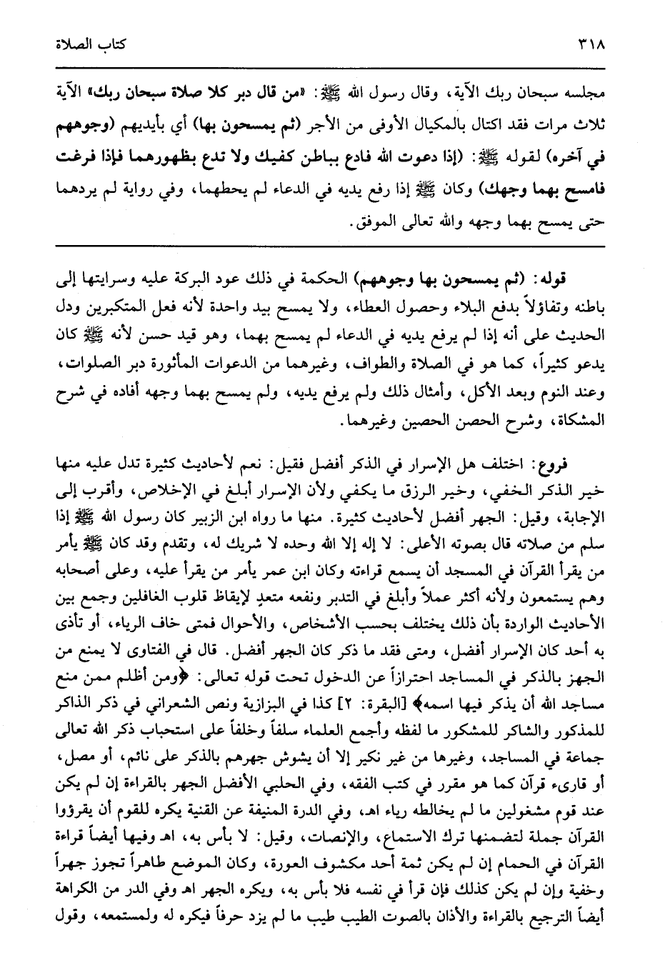 فروع اختلف هل الإسرار في الذكر أفضل فقيل نعم لأحاديث كثيرة تدل عليه منها خير الذكر الخفي وخير الرزق ما يكفي ولأن الإسرار أبلغ في الإخلاص وأقرب إلى الإجابة وقيل الجهر أفضل لأحاديث كثيرة منها ما رواه ابن الزبير كان رسول الله صلى الله عليه وسلم إذا سلم من صلاته قال بصوته إلا على لا إله إلا الله وحده لا شريك له وتقدم وقد كان صلى الله عليه وسلم إذا سلم من صلاته قال بصوته إلا على لا إله إلا الله وحده لا شريك له وتقدم وقد كان صلى الله عليه وسلم يأمر من يقرأ القرآن في المسجد أن يسمع قراءته وكان ابن عمر يأمر من يقرأ عليه وعلى أصحابه وهم يستمعون ولأنه أكثر عملا وأبلغ في التدبر ونفعه متعد لإيقاظ قلوب الغافلين وجمع بين الأحاديث الواردة بأن ذلك يختلف بحسب الأشخاص والأحوال فمتى خاف الرياء أو تأذى به أحد كان الإسرار أفضل ومتى فقد ما ذكر كان الجهر أفضل قال في الفتاوى لا يمنع من الجهز بالذكر في المساجد احترازا عن الدخول تحت قوله تعالى: {وَمَنْ أَظْلَمُ مِمَّنْ مَنَعَ مَسَاجِدَ اللَّهِ أَنْ يُذْكَرَ فِيهَا اسْمُهُ} [البقرة: 114] كذا في البزازية ونص الشعراني في ذكر الذاكر للمذكور والشاكر للمشكور ما لفظه وأجمع العلماء سلفا وخلفا على استحباب ذكر الله تعالى جماعة في المساجد وغيرها من غير نكير إلا أن يشوش جهرهم بالذكر على نائم أو مصل أو قارىء قرآن كما هو مقرر في كتب الفقه وفي الحلبي الأفضل الجهر بالقراءة إن لم يكن عند قوم مشغولين ما لم يخالطه رياء اهـ وفي الدرة المنيفة عن القنية يكره للقوم أن يقرؤوا القرآن جملة لتضمنها ترك الاستماع والإنصات وقيل لا بأس به اهـ وفيها أيضا قراءة القرآن في الحمام إن لم يكن ثمة أحد مكشوف العورة وكان الموضع طاهرا تجوز جهرا وخفية وإن لم يكن كذلك فإن قرأ في نفسه فلا بأس به ويكره الجهر اهـ وفي الدر من الكراهة أيضا الترجيع بالقراءة والأذان بالصوت الطيب طيب ما لم يزد حرفا فيكره له ولمستمعه وقول
