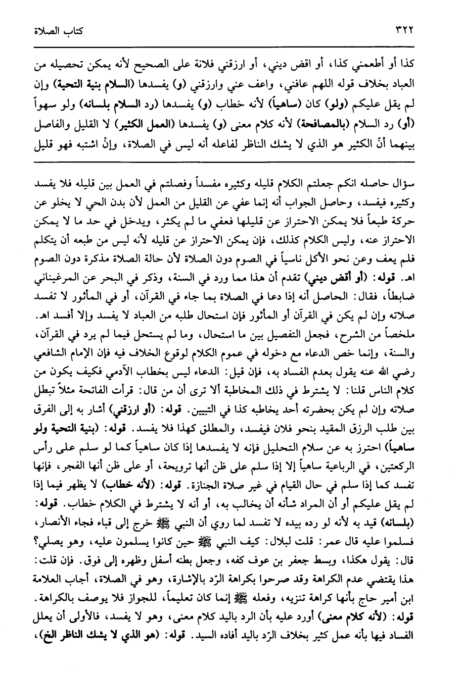 سؤال حاصله انكم جعلتم الكلام قليله وكثيره مفسدا وفصلتم في العمل بين قليله فلا يفسد وكثيره فيفسد وحاصل الجواب أنه إنما عفي عن القليل من العمل لأن بدن الحي لا يخلو عن حركة طبعا فلا يمكن الاحتراز عن قليلها فعفي ما لم يكثر ويدخل في حد ما لا يمكن الاحتراز عنه وليس الكلام كذلك فإن يمكن الاحتراز عن قليله لأنه ليس من طبعه أن يتكلم فلم يعف وعن نحو الأكل ناسيا في الصوم دون الصلاة لأن حالة الصلاة مذكرة دون الصوم اهـ قوله: "أو أقض ديني" تقدم أن هذا مما ورد في السنة وذكر في البحر عن المرغيناني ضابطا فقال الحاصل: أنه إذا دعا في الصلاة بما جاء في القرآن أو في المأثور لا تفسد صلاته وإن لم يكن في القرآن أو المأثور فإن استحال طلبه من العباد لا يفسد وإلا أفسد اهـ ملخصا من الشرح فجعل التفصيل بين ما استحال وما لم يستحل فيما لم يرد في القرآن والسنة وإنما خص الدعاء مع دخوله في عموم الكلام لوقوع الخلاف فيه فإن الإمام الشافعي رضي الله عنه يقول بعدم الفساد به فإن قيل الدعاء ليس بخطاب الآدمي فكيف يكون من كلام الناس قلنا لا يشترط في ذلك المخاطبة ألا ترى أن من قال قرأت الفاتحة مثلا تبطل صلاته وإن لم يكن بحضرته أحد يخاطبه كذا في التبيين قوله: "أو ارزقني" أشار به إلى الفرق بين طلب الرزق المقيد بنحو فلان فيفسد والمطلق كهذا فلا يفسد قوله: "بنية التحية ولو ساهيا" احترز به عن سلام التحليل فإنه لا يفسدها إذا كان ساهيا كما لو سلم على رأس الركعتين في الرباعية ساهيا إلا إذا سلم على ظن أنها ترويحة أو على ظن أنها الفجر فإنها تفسد كما إذا سلم في حال القيام في غير صلاة الجنازة قوله: "لأنه خطاب" لا يظهر فيما إذا لم يقل عليكم أو أن المراد شأنه أن يخالب به أو أنه لا يشترط في الكلام خطاب قوله: "بلسانه" قيد به لأنه لو رده بيده لا تفسد لما روي أن النبي صلى الله عليه وسلم خرج إلى قباء فجاء الأنصار فسلموا عليه قال عمر قلت لبلال كيف النبي صلى الله عليه وسلم حين كانوا يسلمون عليه وهو يصلي قال يقول هكذا وبسط جعفر بن عوف كفه وجعل بطنه أسفل وظهره إلى فوق فإن قلت هذا يقتضي عدم الكراهة وقد صرحوا بكراهة الرد بالإشارة وهو في الصلاة أجاب العلامة ابن أمير حاج بأنها كراهة تنزيه وفعله صلى الله عليه وسلم إنما كان تعليما للجواز فلا يوصف بالكراهة قوله: "لأنه كلام معنى" أورد عليه بأن الرد باليد كلام معنى وهو لا يفسد فالأولى أن يعلل الفساد فيها بأنه عمل كثير بخلاف الرد باليد أفاده السيد قوله: "هو الذي لا يشك الناظر الخ"