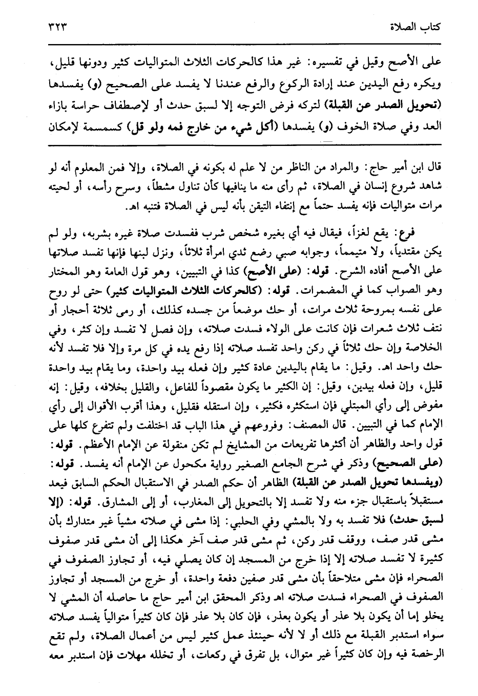 فرع يقع لغزا فيقال فيه أي بغيره شخص شرب ففسدت صلاة غيره بشربه ولو لم يكن مقتديا ولا متيمما وجوابه صبي رضع ثدي امرأة ثلاثا ونزل لبنها فإنها تفسد صلاتها على الأصح أفاده الشرح قوله: "على الأصح" كذا في التبيين وهو قول العامة وهو المختار وهو الصواب كما في المضمرات قوله: "كالحركات الثلاث المتواليات كثير" حتى لو روح على نفسه بمروحة ثلاث مرات أو حك موضعا من جسده كذلك أو رمى ثلاثة أحجار أو نتف ثلاث شعرات فإن كانت على الولاء فسدت صلاته وإن فصل لا تفسد وإن كثر وفي الخلاصة وإن حك ثلاثا في ركن واحد تفسد صلاته إذا رفع يده في كل مرة وإلا فلا تفسد لأنه حك واحد اهـ وقيل ما يقام باليدين عادة كثير وإن فعله بيد واحدة وما يقام بيد واحدة قليل وإن فعله بيدين وقيل إن الكثير ما يكون مقصودا للفاعل والقليل بخلافه وقيل إنه مفوض إلى رأي المبتلي فإن استكثره فكثير وإن استقله فقليل وهذا أقرب الأقوال إلى رأي الإمام كما في التبيين قال المصنف وفروعهم في هذا الباب قد اختلفت ولم تتفرع كلها على قول واحد والظاهر أن أكثرها تفريعات من المشايخ لم تكن منقولة عن الإمام الأعظم قوله: "على الصحيح" وذكر في شرح الجامع الصغير رواية مكحول عن الإمام أنه يفسد قوله: "ويفسدها تحويل الصدر عن القبلة" الظاهر أن حكم الصدر في الاستقبال الحكم السابق فيعد مستقبلا باستقبال جزء منه ولا تفسد إلا بالتحويل إلى المغارب أو إلى المشارق قوله: "إلا لسبق حدث" فلا تفسد به ولا بالمشي وفي الحلبي إذا مشى في صلاته مشيا غير متدارك بأن مشى قدر صف ووقف قدر ركن ثم مشى قدر صف آخر هكذا إلى أن مشى قدر صفوف كثيرة لا تفسد صلاته إلا إذا خرج من المسجد إن كان يصلي فيه أو تجاوز الصفوف في الصحراء فإن مشى متلاحقا بأن مشى قدر صفين دفعة واحدة أو خرج من المسجد أو تجاوز الصفوف في الصحراء فسدت صلاته اهـ وذكر المحقق ابن أمير حاج ما حاصله أن المشي لا يخلو إما أن يكون بلا عذر أو يكون بعذر فإن كان بلا عذر فإن كان كثيرا متواليا يفسد صلاته سواء استدبر القبلة مع ذلك أو لا لأنه حينئذ عمل كثير ليس من أعمال الصلاة ولم تقع الرخصة فيه وإن كان كثيرا غير متوال بل تفرق في ركعات أو تخلله مهلات فإن استدبر معه