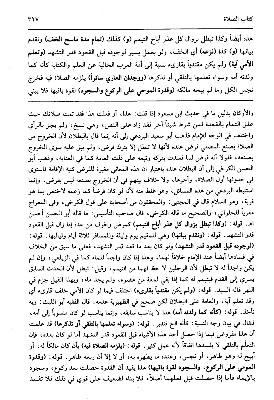 والأركان بدليل ما في حديث ابن مسعود إذا قلت هذا أو فعلت هذا فقد تمت صلاتك حيث علق التمام بالقعدة فمن شرط شيئا آخر فقد زاد على النص وهي نسخ ولم يجز بالرأي واختلف في الوجه للإمام فذهب أبو سعيد البردعي إلى أنه إنما قال بالبطلان لأن الخروج من الصلاة بصنع المصلي فرض عنده لأنها لا تبطل إلا بترك فرض ولم يبق عليه سوى الخروج بصنعه فلولا أنه فرض لما فسدت بتركه وتبعه على ذلك العامة كما في العناية وذهب أبو الحسن الكرخي إلى أن البطلان عنده باعتبار ان هذه المعاني مغيرة للفرض كنية الإقامة فاستوى في حدوثها أول الصلاة وآخرها ولا خلاف بينهم في أن الخروج بصنعه ليس بفرض وإنما استنبطه البردعي من هذه المسائل وهو غلط منه لأنه لو كان فرضا كما زعمه لاختص بما هو قربة وهو السلام قال في المجتبى والمحققون من أصحابنا على قول الكرخي وفي المعراج معزيا للحلواني والصحيح ما قاله الكرخي قال صاحب التأسيس ما قالهأبو الحسن أحسن اهـ قوله "وكذا تبطل بزوال كل عذر أباح التيمم" كمرض وخوف من عدة إذا زال قبل القعود قدر التشهد قوله: "وتقدم بيانها" وهي للمقيم يوم وليلة وللمسافر ثلاثة أيام ولياليها قوله: "لوجوده قبل القعود قدر التشهد" ولو كان بعد ما قعد قدر التشهد فعلى ما سبق من الخلاف في فسادها أيضا عند الإمام خلافا لهما وهذا إذا كان واجدا للماء كما في الزيلعي وإن لم يكن واجدا له لا تبطل لأن الرجلين لا حظ لهما من التيمم وقيل تبطل لأن الحدث السابق يسري إلى القدم فيتيمم له كما إذا بقي لمعة من عضوه ولم يجد ماء وبهذا القيل جزم في النهر قاله السيد قوله: "ولم يكن مقتديا بقارىء" اختلف فيما لو كان الأمي خلف قارىء أي وقد تعلم آية والعامة على البطلان لكن صحح في الظهيرية عدمه قالالفقيه أبو الليث وبه نأخذ قوله: "كأنه كما ولدته أمه" هذا لا يناسب سابقه وإنما يناسب لو كان منسوبا إلى أمه فيقال في بيان وجه النسبة كأنه الخ فتدبر قوله: "وسواء تعلمها بالتلقي أو تذكرها" قد علمت أن هذا مفروض فيما إذا حصل أحد هذه الأشياء قبل القعود قدر التشهد أما لو كان بعده فإن التعلم بالتلقي لا يفسدها اتفاقا لأنه عمل كثير قوله: "يلزمه الصلاة فيه" بأن كان مالكا له أو أبيح له وهو طاهر أو نجس وعنده ما يطهره به أو لا إلا أن ربعه طاهر قوله: "وقدرة المومي على الركوع والسجود لقوة باقيها" هذا يفيد أن القدرة حصلت بعد ركوع وسجود بالإيماء فأما إذا حصلت قبل فعلهما أصلا فلا بناء لضعيف على قوي في ذلك فلا تفسد