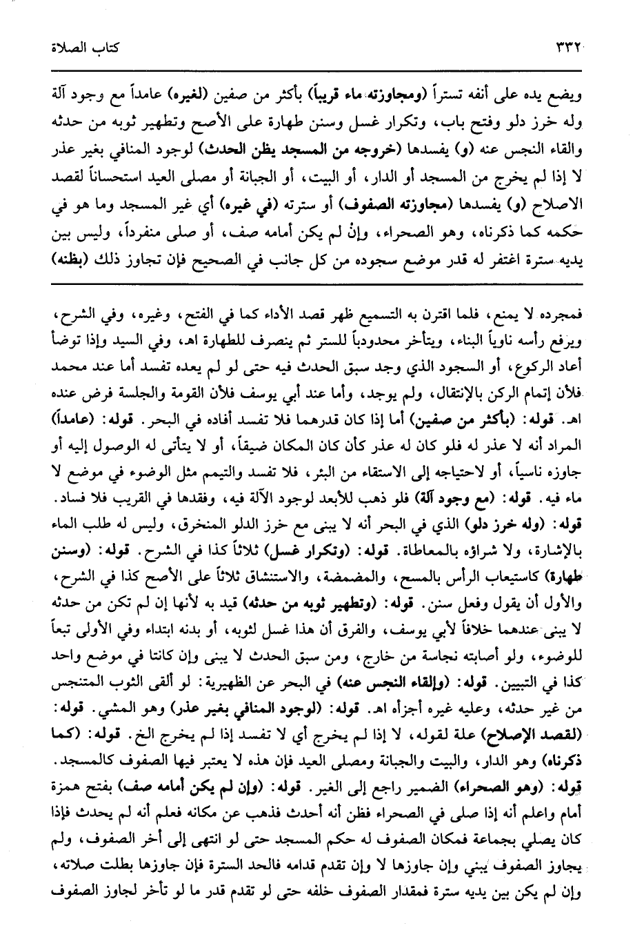 فمجرده لا يمنع فلما اقترن به التسميع ظهر قصد الأداء كما في الفتح وغيره وفي الشرح ويرفع رأسه ناويا البناء ويتأخر محدودبا للستر ثم ينصرف للطهارة اهـ وفي السيد وإذا توضأ أعاد الركوع أو السجود الذي وجد سبق الحدث فيه حتى لو لم يعده تفسد أما عند محمد فلأن إتمام الركن بالإنتقال ولم يوجد وأما عند أبي يوسف فلأن القومة والجلسة فرض عنده اهـ قوله: "بأكثر من صفين" أما إذا كان قدرهما فلا تفسد أفاده في البحر قوله: "عامدا" المراد أنه لا عذر له فلو كان له عذر كأن كان المكان ضيقا أو لا يتأتى له الوصول إليه أو جاوزه ناسيا أو لاحتياجه إلى الاستقاء من البئر فلا تفسد والتيمم مثل الوضوء في موضع لا ماء فيه قوله: "مع وجود آلة" فلو ذهب للأبعد لوجود الآلة فيه وفقدها في القريب فلا فساد قوله: "وله خرز دلو" الذي في البحر أنه لا يبنى مع خرز الدلو المنخرق وليس له طلب الماء بالإشارة ولا شراؤه بالمعاطاة قوله: "وتكرار غسل" ثلاثا كذا في الشرح قوله: "وسنن طهارة" كاستيعاب الرأس بالمسح والمضمضة والاستنشاق ثلاثا على الأصح كذا في الشرح والأول أن يقول وفعل سنن قوله: "وتطهير ثوبه من حدثه" قيد به لأنها إن لم تكن من حدثه لا يبنى عندهما خلافا لأبي يوسف والفرق أن هذا غسل لثوبه أو بدنه ابتداء وفي الأولى تبعا للوضوء ولو أصابته نجاسة من خارج ومن سبق الحدث لا يبنى وإن كانتا في موضع واحد كذا في التبيين قوله: "وإلقاء النجس عنه" في البحر عن الظهيرية لو ألقى الثوب المتنجس من غير حدثه وعليه غيره أجزأه اهـ قوله: "لوجود المنافي بغير عذر" وهو المشي قوله: "لقصد الإصلاح" علة لقوله لا إذا لم يخرج أي لا تفسد إذا لم يخرج الخ قوله: "كما ذكرناه" وهو الدار والبيت والجبانة ومصلى العيد فإن هذه لا يعتبر فيها الصفوف كالمسجد قوله: "وهو الصحراء" الضمير راجع إلى الغير قوله: "وإن لم يكن أمامه صف" بفتح همزة أمام واعلم أنه إذا صلى في الصحراء فظن أنه أحدث فذهب عن مكانه فعلم أنه لم يحدث فإذا كان يصلي بجماعة فمكان الصفوف له حكم المسجد حتى لو انتهى إلى أخر الصفوف ولم يجاوز الصفوف يبني وإن جاوزها لا وإن تقدم قدامه فالحد السترة فإن جاوزها بطلت صلاته وإن لم يكن بين يديه سترة فمقدار الصفوف خلفه حتى لو تقدم قدر ما لو تأخر لجاوز الصفوف.