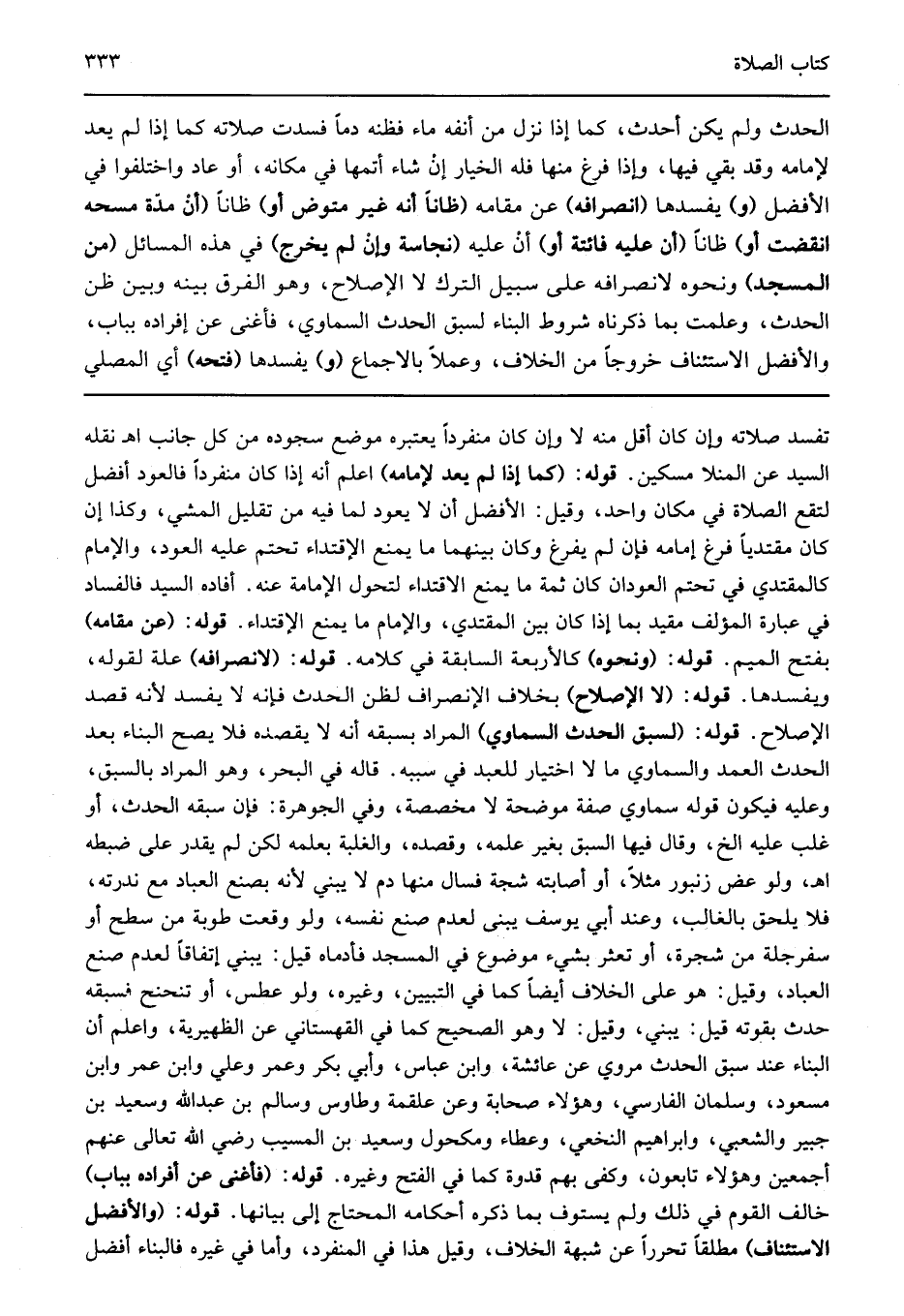 تفسد صلاته وإن كان أقل منه لا وإن كان منفردا يعتبره موضع سجوده من كل جانب اهـ نقله السيد عن المنلا مسكين قوله: "كما إذا لم يعد لإمامه" اعلم أنه إذا كان منفردا فالعود أفضل لتقع الصلاة في مكان واحد وقيل الأفضل أن لا يعود لما فيه من تقليل المشي وكذا إن كان مقتديا فرغ إمامه فإن لم يفرغ وكان بينهما ما يمنع الإقتداء تحتم عليه العود والإمام كالمقتدي في تحتم العودان كان ثمة ما يمنع الاقتداء لتحول الإمامة عنه أفاده السيد فالفساد في عبارة المؤلف مقيد بما إذا كان بين المقتدي والإمام ما يمنع الإقتداء قوله: "عن مقامه" بفتح الميم قوله: "ونحوه" كالأربعة السابقة في كلامه قوله: "لانصرافه" علة لقوله ويفسدها قوله: "لا الإصلاح" بخلاف الإنصراف لظن الحدث فإنه لا يفسد لأنه قصد الإصلاح قوله: "لسبق الحدث السماوي" المراد بسبقه أنه لا يقصده فلا يصح البناء بعد الحدث العمد والسماوي ما لا اختيار للعبد في سببه قاله في البحر وهو المراد بالسبق وعليه فيكون قوله سماوي صفة موضحة لا مخصصة وفي الجوهرة فإن سبقه الحدث أو غلب عليه الخ وقال فيها السبق بغير علمه وقصده والغلبة بعلمه لكن لم يقدر على ضبطه اهـ ولو عض زنبور مثلا أو أصابته شجة فسال منها دم لا يبني لأنه بصنع العباد مع ندرته فلا يلحق بالغالب وعند أبي يوسف يبنى لعدم صنع نفسه ولو وقعت طوبة من سطح أو سفرجلة من شجرة أو تعثر بشيء موضوع في المسجد فأدماه قيل يبني إتفاقا لعدم صنع العباد وقيل هو على الخلاف أيضا كما في التبيين وغيره ولو عطس أو تنحنح فسبقه حدث بقوته قيل يبني وقيل لا وهو الصحيح كما في القهستاني عن الظهيرية واعلم أن البناء عند سبق الحدث مروي عن عائشة وابن عباس وأبي بكر وعمر وعلي وابن عمر وابن مسعود وسلمان الفارسي وهؤلاء صحابة وعن علقمة وطاوس وسالم بن عبد الله وسعيد بن جبير والشعبي وابراهيم النخعي وعطاء ومكحول وسعيد بن المسيب رضي الله تعالى عنهم أجمعين وهؤلاء تابعون وكفى بهم قدوة كما في الفتح وغيره قوله: "فأغنى عن أفراده بباب" خالف القوم في ذلك ولم يستوف بما ذكره أحكامه المحتاج إلى بيانها قوله: "والأفضل الاستئناف" مطلقا تحررا عن شبهة الخلاف وقيل هذا في المنفرد وأما في غيره فالبناء أفضل