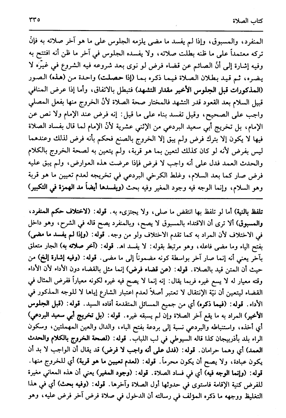 تلفظ بالنية" أما لو تلفظ بها انتقض ما صلى ولا يجتزىء به قوله: "لاختلاف حكم المنفرد والمسبوق" ألا ترى أن الاقتداء بالمسبوق لا يصح وبالمنفرد يصح قاله في الشرح وهو داخل في الاختلاف لأن المراد به كما تقدم الاختلاف ولو من وجه قوله: "وإذا لم يفسد ما مضى" بفتح الياء وما مضى فاعله وهو مرتبط بقوله لا يفسد اهـ قوله: "آخر صلاته به" الجار متعلق بآخر يعني أنه إنما صار آخر بواسطة كونه مضمونا إلى ما مضى قوله: "وفيه إشارة إلخ" من حيث أن المتن قيد بالصلاة قوله: "عن قضاء فرض" إنما مثل بالقضاء دون الأداء لأن الأداء وقته معيار له لا يسع غيره فربما يقال انه إنما لا يصح فيه غيره لكونه معيارا ففرض المثال في القضاء ليتعين أن نية الإنتقال لا تعتبر أصلا لعدم اعتبار الشارع إياها لا للوجه المذكور في الأداء قوله: "فيما ذكره" أي من جميع المسائل المتقدمة أفاده السيد قوله: "قبل الجلوس الأخير" المراد به ما يقع آخر الصلاة وإن لم يسبقه غيره قوله: "بل تخريج أبي سعيد البردعي" أي أخذه واستنباطه والبردعي نسبة إلى بردعة بفتح الباء والدال والعين المهملتين وسكون الراء بلد بأذربيجان كذا قاله السيوطي في لب اللباب قوله: "لصحة الخروج بالكلام والحدث العمد" أي وهما حرامان قوله: "فدل على أنه واجب لا فرض" قد يقال أن الواجب لا بد أن يكون عبادة ولا يصح أن يكون محرما قوله: "لعدم تعيين ما هو قربة" أي للخروج منها قوله: "وإنما الوجه فيه" أي في فساد الصلاة قوله: "وجود المغير" يعني أن هذه المعاني مغيرة للفرض كنية الإقامة فاستوى في حدوثها أول الصلاة وآخرها قوله: "وفيه بحث" أي في هذا التغليظ ووجهه ما ذكره المؤلف في رسالته أن الدخول في صلاة فرض آخر فرض عليه وهو