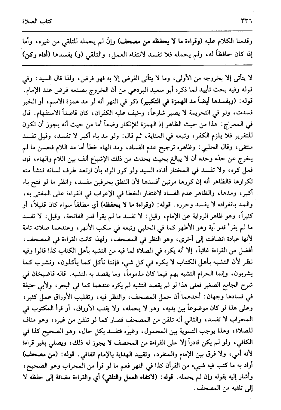لا يتأتى إلا بخروجه من الأولى وما لا يتأتى الفرض إلا به فهو فرض ولذا قال السيد وفي قوله وفيه بحث تأييد لما ذكره أبو سعيد البردعي من أن الخروج بصنعه فرض عند الإمام قوله: "ويفسدها أيضا مد الهمزة في التكبير" ذكر في النهر أنه لو مد همزة الاسم أو الخبر فسدت ولو في التحريمة لا يصير شارعا وخيف عليه الكفران كان قاصدا الاستفهام قال في المعراج هذا من حيث الظاهر إذ الهمزة للإنكار وضعا أما من حيث انه يجوز أن تكون للتقرير فلا يلزم الكفر وتبعه في العناية ثم قال ولو مد باء أكبر لا تفسد وقيل تفسد منتقى وقال الحلبي وظاهره ترجيح عدم الفساد ومد الهاء خطأ أما مد اللام فحسن ما لم يخرج عن حده وحده أن لا يبالغ بحيث يحدث من ذلك الإشباع ألف بين اللام والهاء فإن فعل كره ولا تفسد في المختار أفاده السيد ولو كرر الراء بأن ارتعد طرف لسانه فنشأ منه تكرارها فالظاهر أنه إن كررها مرتين أفسدها لأن النطق بحرفين مفسد وانظر ما لو فتح باء أكبر ومدها والظاهر عدم الفساد لاغتفار الخطا في الإعراب في القراءة على المفتى به والمد بانفراده لا يفسد وحرره قوله: "وقراءة ما لا يحفظه" أي مطلقا سواء كان قليلا أو كثيرا وهو ظاهر الرواية عن الإمام وقيل لا تفسد ما لم يقرأ قدر الفاتحة وقيل لا تفسد ما لم يقرأ قدر آية وهو الأطهر كما في الحلبي وتبعه في سكب الأنهر وعندهما صلاته تامة لأنها عبادة انضافت إلى أخرى وهو النظر في المصحف ولهذا كانت القراءة في المصحف أفضل من القراءة غائبا إلا أنه يكره في الصلاة لما فيه من التشبه بأهل الكتاب كذا قالوا: وفيه نظر لأن التشبه بأهل الكتاب لا يكره في كل شيء فاننا نأكل كما يأكلون ونشرب كما يشربون وإنما الحرام التشبه بهم فيما كان مذموما وما يقصد به التشبه قاله قاضيخان في شرح الجامع الصغير فعلى هذا لو لم يقصد التشبه لم يكره عندهما كما في البحر ولأبي حنيفة في فسادها وجهان أحدهما أن حمل المصحف والنظر فيه وتقليب الأوراق عمل كثير وعلى هذا لو كان موضوعا بين يديه وهو لا يحمله ولا يقلب الأوراق أو قرأ المكتوب في المحراب لا تفسد والثاني أنه تلقن من المصحف فصار كما لو تلقن من غيره وهو مناف للصلاة وهذا يوجب التسوية بين المحمول وغيره فتفسد بكل حال وهو الصحيح كذا في الكافي ولو لم يكن قادرا إلا على القراءة من المحصف لا يجوز له ذلك ويصلي بغير قراءة لأنه أمي ولا فرق بين الإمام والمنفرد وتقييد الهداية بالإمام اتفاقي قوله: "من مصحف" أراد به ما كتب فيه شييء من القرآن كذا في النهر فعم ما لو قرأ من المحراب وهو الصحيح وأشار إليه بقوله وإن لم يحمله قوله: "لانتفاء العمل والتلقي" أي والقراءة مضافة إلى حفظه لا إلى تلقيه من المصحف