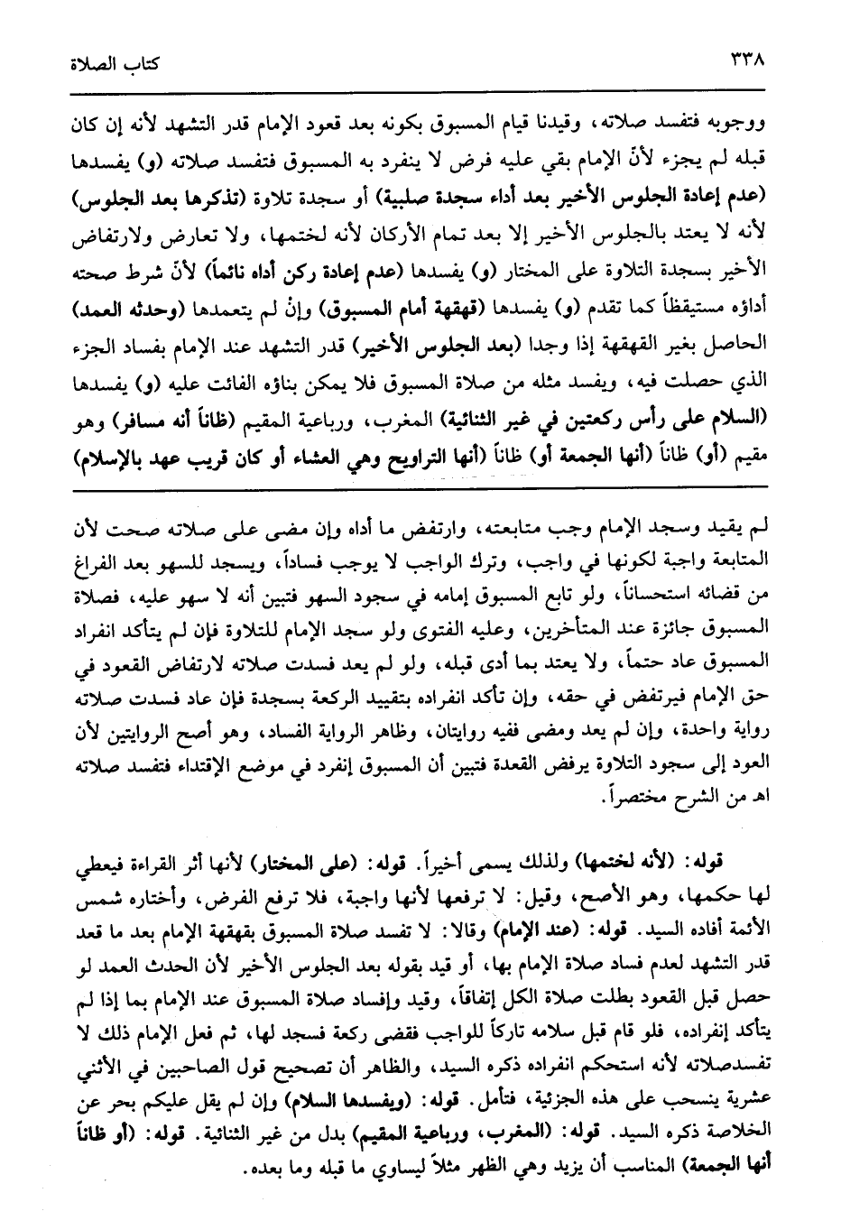 قوله: "لأنه لختمها" ولذلك يسمى أخيرا قوله: "على المختار" لأنها أثر القراءة فيعطي لها حكمها وهو الأصح وقيل لا ترفعها لأنها واجبة فلا ترفع الفرض وأختاره شمس الأئمة أفاده السيد قوله: "عند الإمام" وقالا لا تفسد صلاة المسبوق بقهقهة الإمام بعد ما قعد قدر التشهد لعدم فساد صلاة الإمام بها أو قيد بقوله بعد الجلوس الأخير لأن الحدث العمد لو حصل قبل القعود بطلت صلاة الكل إتفاقا وقيد وإفساد صلاة المسبوق عند الإمام بما إذا لم يتأكد إنفراده فلو قام قبل سلامه تاركا للواجب فقضى ركعة فسجد لها ثم فعل الإمام ذلك لا تفسدصلاته لأنه استحكم انفراده ذكره السيد والظاهر أن تصحيح قول الصاحبين في الأثني عشرية ينسحب على هذه الجزئية فتأمل قوله: "ويفسدها السلام" وإن لم يقل عليكم بحر عن الخلاصة ذكره السيد قوله: "المغرب ورباعية المقيم" بدل من غير الثنائية قوله: "أو ظانا أنها الجمعة" المناسب أن يزيد وهي الظهر مثلا ليساوي ما قبله وما بعده.