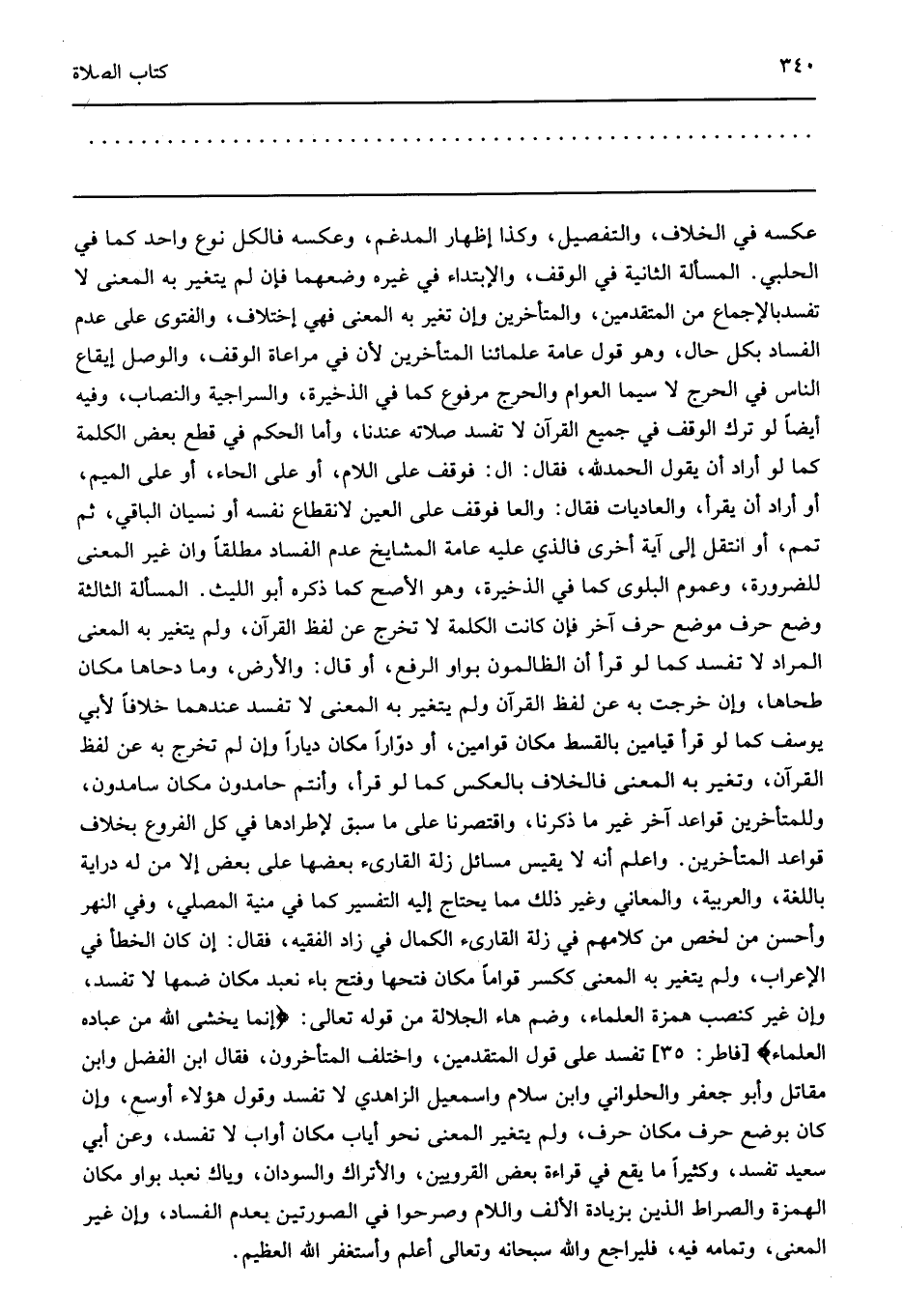 عكسه في الخلاف والتفصيل وكذا إظهار المدغم وعكسه فالكل نوع واحد كما في الحلبي المسألة الثانية في الوقف والإبتداء في غيره وضعهما فإن لم يتغير به المعنى لا تفسدبالإجماع من المتقدمين والمتأخرين وإن تغير به المعنى فهي إختلاف والفتوى على عدم الفساد بكل حال وهو قول عامة علمائنا المتأخرين لأن في مراعاة الوقف والوصل إيقاع الناس في الحرج لا سيما العوام والحرج مرفوع كما في الذخيرة والسراجية والنصاب وفيه أيضا لو ترك الوقف في جميع القرآن لا تفسد صلاته عندنا وأما الحكم في قطع بعض الكلمة كما لو أراد أن يقول الحمدلله فقال: ال فوقف على اللام أو على الحاء أو على الميم أو أراد أن يقرأ والعاديات فقال: والعا فوقف على العين لانقطاع نفسه أو نسيان الباقي ثم تمم أو انتقل إلى آية أخرى فالذي عليه عامة المشايخ عدم الفساد مطلقا وان غير المعنى للضرورة وعموم البلوى كما في الذخيرة وهو الأصح كما ذكره أبو الليث المسألة الثالثة وضع حرف موضع حرف آخر فإن كانت الكلمة لا تخرج عن لفظ القرآن ولم يتغير به المعنى المراد لا تفسد كما لو قرأ أن الظالمون بواو الرفع أو قال والأرض وما دحاها مكان طحاها وإن خرجت به عن لفظ القرآن ولم يتغير به المعنى لا تفسد عندهما خلافا لأبي يوسف كما لو قرأ قيامين بالقسط مكان قوامين أو دوارا مكان ديارا وإن لم تخرج به عن لفظ القرآن وتغير به المعنى فالخلاف بالعكس كما لو قرأ وأنتم خامدون مكان سامدون وللمتأخرين قواعد آخر غير ما ذكرنا واقتصرنا على ما سبق لإطرادها في كل الفروع بخلاف قواعد المتأخرين واعلم أنه لا يقيس مسائل زلة القارىء بعضها على بعض إلا من له دراية باللغة والعربية والمعاني وغير ذلك مما يحتاج إليه التفسير كما في منية المصلي وفي النهر وأحسن من لخص من كلامهم في زلة القارىء الكمال في زاد الفقيه فقال: إن كان الخطأ في الإعراب ولم يتغير به المعنى ككسر قواما مكان فتحها وفتح باء نعبد مكان ضمها لا تفسد وإن غير كنصب همزة العلماء وضم هاء الجلالة من قوله تعالى: {إِنَّمَا يَخْشَى اللَّهَ مِنْ عِبَادِهِ الْعُلَمَاءُ} [فاطر: 28] تفسد على قول التمقدمين واختلف المتأخرون فقال ابن الفضل وابن مقاتل وأبو جعفر والحلواني وابن سلام واسمعيل الزاهدي لا تفسد وقول هؤلاء أوسع وإن كان بوضع حرف مكان حرف ولم يتغير المعنى نحو أياب مكان أواب لا تفسد وعن أبي سعيد تفسد وكثيرا ما يقع في قراءة بعض القرويين والأتراك والسودان وياك نعبد بواو مكان الهمزة والصراط الذين بزيادة الألف واللام وصرحوا في الصورتين بعدم الفساد وإن غير المعنى وتمامه فيه فليراجع والله سبحانه وتعالى أعلم وأستغفر الله العظيم.