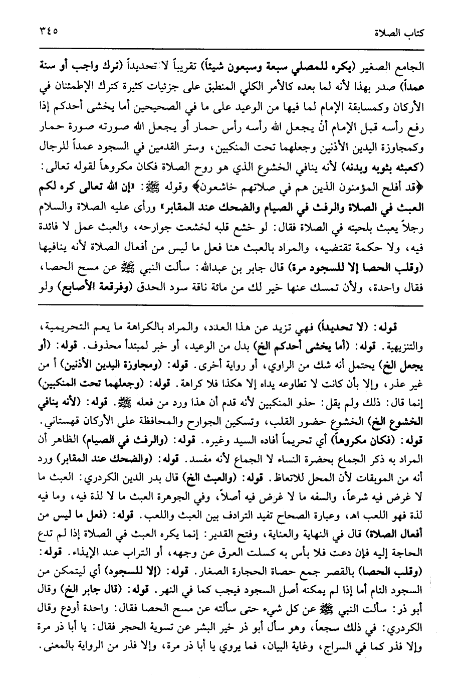 الجامع الصغير "يكره للمصلي سبعة وسبعون شيئا" تقريبا لا تحديدا "ترك واجب أو سنة عمدا" صدر بهذا لأنه لما بعده كالأمر الكلي المنطبق على الجزئيات كثيرة كترك الاطمئنان في الأركان وكمسابقة الإمام لما فيها من الوعيد على ما في الصحيحين "أما يخشى أحدكم إذا رفع رأسه قبل الإمام أن يجعل الله رأسه رأس حمار أو يجعل الله صورته صورة حمار" وكمجاوزة اليدين الأذنين وجعلهما تحت المنكبين وستر القدمين في السجود عمدا للرجال "كعبثه بثوبه وبدنه" لأنه ينافي الخشوع الذي هو روح الصلاة فكان مكروها لقوله تعالى: {قَدْ أَفْلَحَ الْمُؤْمِنُونَ الذين، الَّذِينَ هُمْ فِي صَلاتِهِمْ خَاشِعُونَ} وقوله صلى الله عليه وسلم: "إن الله تعالى كره لكم العبث في الصلاة والرفث في الصيام والضحك عند المقابر" ورأى عليه الصلاة والسلام رجلا يعبث بلحيته في الصلاة فقال: لو خشع قلبه لخشعت جوارحه والعبث عمل لا فائدة فيه ولا حكمة تقتضيه والمراد بالعبث هنا فعل ما ليس من أفعال الصلاة لأنه ينافيها "وقلب الحصى إلا للسجود مرة" قال جابر بن عبد الله سألت النبي صلى الله عليه وسلم عن مسح الحصى فقال: "واحدة ولأن تمسك عنها خير لك من مائة ناقة سود الحدق" "وفرقعة الأصابع" ولو