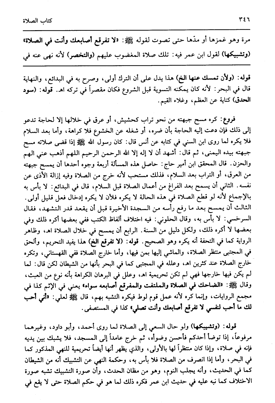 مرة وهو غمزها أو مدها حتى تصوت لقوله صلى الله عليه وسلم: "لا تفرقع أصابعك وأنت في الصلاة" "وتشبيكها" لقول عمر فيه تلك صلاة المغضوب عليهم "والتخصر" لأنه نهي عنه في