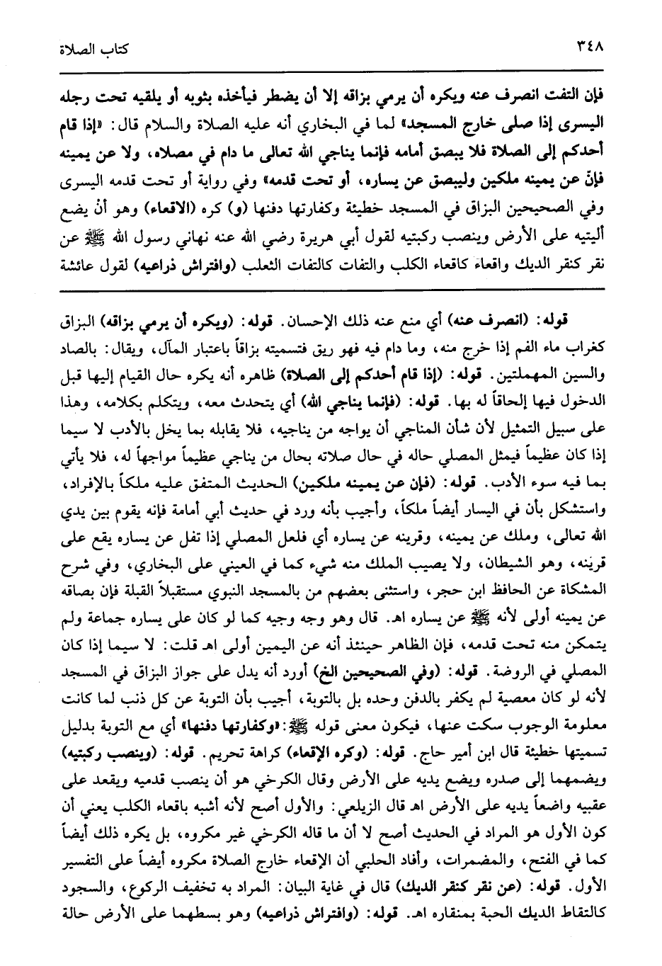 قوله: "انصرف عنه" أي منع عنه ذلك الإحسان قوله: "ويكره أن يرمي بزاقه" البزاق كغراب ماء الفم إذا خرج منه وما دام فيه فهو ريق فتسميته بزاقا باعتبار المآل ويقال بالصاد والسين المهملتين قوله: "إذا قام أحدكم إلى الصلاة" ظاهره أنه يكره حال القيام إليها قبل الدخول فيها إلحاقا له بها قوله: "فإنما يناجي الله" أي يتحدث معه ويتكلم بكلامه وهذا على سبيل التمثيل لأن شأن المناجي أن يواجه من يناجيه فلا يقابله بما يخل بالأدب لا سيما إذا كان عظيما فيمثل المصلي حاله في حال صلاته بحال من يناجي عظيما مواجها له فلا يأتي بما فيه سوء الأدب قوله: "فإن عن يمينه ملكين" الحديث المتفق عليه ملكا بالإفراد واستشكل بأن في اليسار أيضا ملكا وأجيب بأنه ورد في حديث أبي أمامة فإنه يقوم بين يدي الله تعالى وملك عن يمينه وقرينه عن يساره أي فلعل المصلي إذا تفل عن يساره يقع على قرينه وهو الشيطان ولا يصيب الملك منه شيء كما في العيني على البخاري وفي شرح المشكاة عن الحافظ ابن حجر واستثنى بعضهم من بالمسجد النبوي مستقبلا القبلة فإن بصاقه عن يمينه أولى لأنه صلى الله عليه وسلم عن يساره اهـ قال وهو وجه وجيه كما لو كان على يساره جماعة ولم يتمكن منه تحت قدمه فإن الظاهر حينئذ أنه عن اليمين أولى اهـ قلت لا سيما إذا كان المصلى في الروضة قوله: "وفي الصحيحين الخ" أورد أنه يدل على جواز البزاق في المسجد لأنه لو كان معصية لم يكفر بالدفن وحده بل بالتوبة أجيب بأن التوبة عن كل ذنب لما كانت معلومة الوجوب سكت عنها فيكون معنى قوله صلى الله عليه وسلم وكفارتها دفنها أي مع التوبة بدليل تسميتها خطيئة قال ابن أمير حاج قوله: "وكره الإقعاء" كراهة تحريم قوله: "وينصب ركبتيه" ويضمهما إلى صدره ويضع يديه على الأرض وقال الكرخي هو أن ينصب قدميه ويقعد على عقبيه واضعا يديه على الأرض اهـ قالالزيلعي والأول أصح لأنه أشبه باقعاء الكلب يعني أن كون الأول هو المراد في الحديث أصح لا أن ما قالهالكرخي غير مكروه بل يكره ذلك أيضا كما في الفتح والمضمرات وأفاد الحلبي أن الإقعاء خارج الصلاة مكروه أيضا على التفسير الأول قوله: "عن نقر كنقر الديك" قال في غاية البيان المراد به تخفيف الركوع والسجود كالتقاط الديك الحبة بمنقاره اهـ قوله: "وافتراش ذراعيه" وهو بسطهما على الأرض حالة