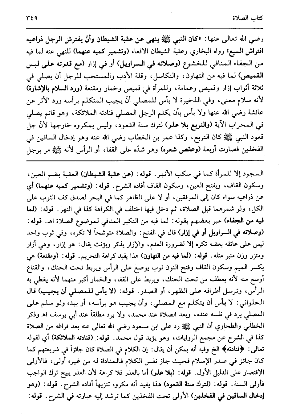 السجود إلا للمرأة كما في سكب الأنهر قوله: "عن عقبة الشيطان" العقبة بضم العين وسكون القاف وبفتح العين وسكون القاف أفاده الشرح قوله: "وتشمير كميه عنهما" أي عن ذراعيه سواء كان إلى المرفقين أو لا على الظاهر كما في البحر لصدق كف الثوب على الكل ولو شمرهما قبل الصلاة ثم دخل فيها اختلف في الكراهة كذا في النهر قوله: "لما فيه من الجفاء" عبر بعضهم بقوله لما فيه من التكبر المنافي لموضوع الصلاة اهـ قوله: "وصلاته في السراويل أو في إزار" قال في الفتح والصلاة متوشحا لا تكره وفي ثوب واحد ليس على عاتقه بعضه تكره إلا لضرورة العدم والإزار يذكر ويؤنث يقال هو إزار وهي أزار ومئزر وزن منبر مثله قوله: "لما فيه من التهاون" هذا يفيد كراهة التحريم قوله: "ومقنعة" هي بكسر الميم وسكون القاف وفتح النون ثوب يوضع على الرأس ويربط تحت الحنك والقناع أوسع منه لأنه يعطف من تحت الحنك ويربط على القفا والخمار أكبر منهما لأنه يغطي به الرأس وترسل أطرافه على الظهر أو الصدر قوله: "لا بأس للمصلي أن يجيب" قال الحلواني لا بأس أن يتكلم مع المصلي وأن يجيب هو برأسه أو بيده ولو سلم على المصلي يرد في نفسه عنده وبعد الصلاة عند محمد ولا يرد مطلقا عند أبي يوسف اهـ وذكر الخطابي والطحاوي أن النبي صلى الله عليه وسلم رد على ابن مسعود رضي الله تعالى عنه بعد فراغه من الصلاة كذا في الشرح عن مجمع الروايات وهو يؤيد قول محمد قوله: "فنادته الملائكة" أي لقوله تعالى: {فَنَادَتْهُ} الخ وفيه أنه يمكن أن يقال إن الكلام في الصلاة كان جائزا في شريعتهم كما كان جائز في صدر الإسلام فحيث جاز نفس الكلام فالمناداة له من غيره أولى فالأولى الإقتصار على الدليل الأول قوله: "بلا عذر" أما بالعذر فلا كراهة لأن العذر يبيح ترك الواجب فأولى السنة قوله: "لترك سنة القعود" هذا يفيد أنه مكروه تنزيها أفاده الشرح قوله: "وهو إدخال الساقين في الفخذين" الأولى تحت الفخذين كما ترشد إليه عبارته في الشرح قوله: