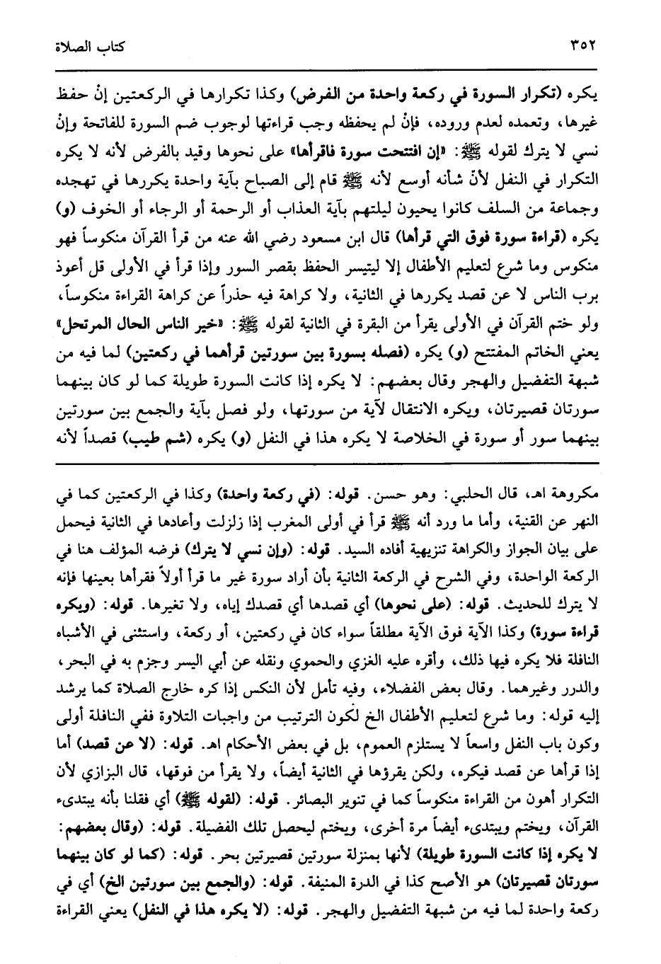 يكره "تكرار السورة في ركعة واحدة من الفرض" وكذا تكرارها في الركعتين إن حفظ غيرها وتعمده لعدم وروده فإن لم يحفظه وجب قراءتها لوجوب ضم السورة للفاتحة وإن نسي لا يترك لقوله صلى الله عليه وسلم: "إن افتتحت سورة فاقرأها على نحوها" وقيد بالفرض لأنه لا يكره التكرار في النفل لأن شأنه أوسع لأنه صلى الله عليه وسلم قام إلى الصباح بآية واحدة يكررها في تهجده وجماعة من السلف كانوا يحيون ليلتهم بآية العذاب أو الرحمة أو الرجاء أو الخوف "و" يكره "قراءة سورة فوق التي قرأها" قال ابن مسعود رضي الله عنه "من قرأ القرآن منكوسا فهو منكوس وما شرع لتعليم الأطفال إلا ليتيسر الحفظ بقصر السورة وإذا قرأ في الأولى قل أعوذ برب الناس لا عن قصد يكررها في الثانية ولا كراهة فيه حذرا عن كراهة القراءة منكوسة ولو ختم القرآن في الأولى يقرأ من البقرة في الثانية لقوله صلى الله عليه وسلم: "خير الناس المرتحل" يعني الخاتم المفتتح "و" يكره "فصله بسورة بين سورتين قرأهما في ركعتين" لما فيه من شبهة التفضيل والهجر وقال بعضهم لا يكره إذا كانت السورة طويلة كما لو كان بينهما سورتان قصيرتان ويكره الانتقال لآية من سورتها ولو فصل بآيات والجمع بين سورتين بينهما سور أو سورة وفي الخلاصة لا يكره هذا في النفل "و" يكره "شم طيب" قصدا لأنه