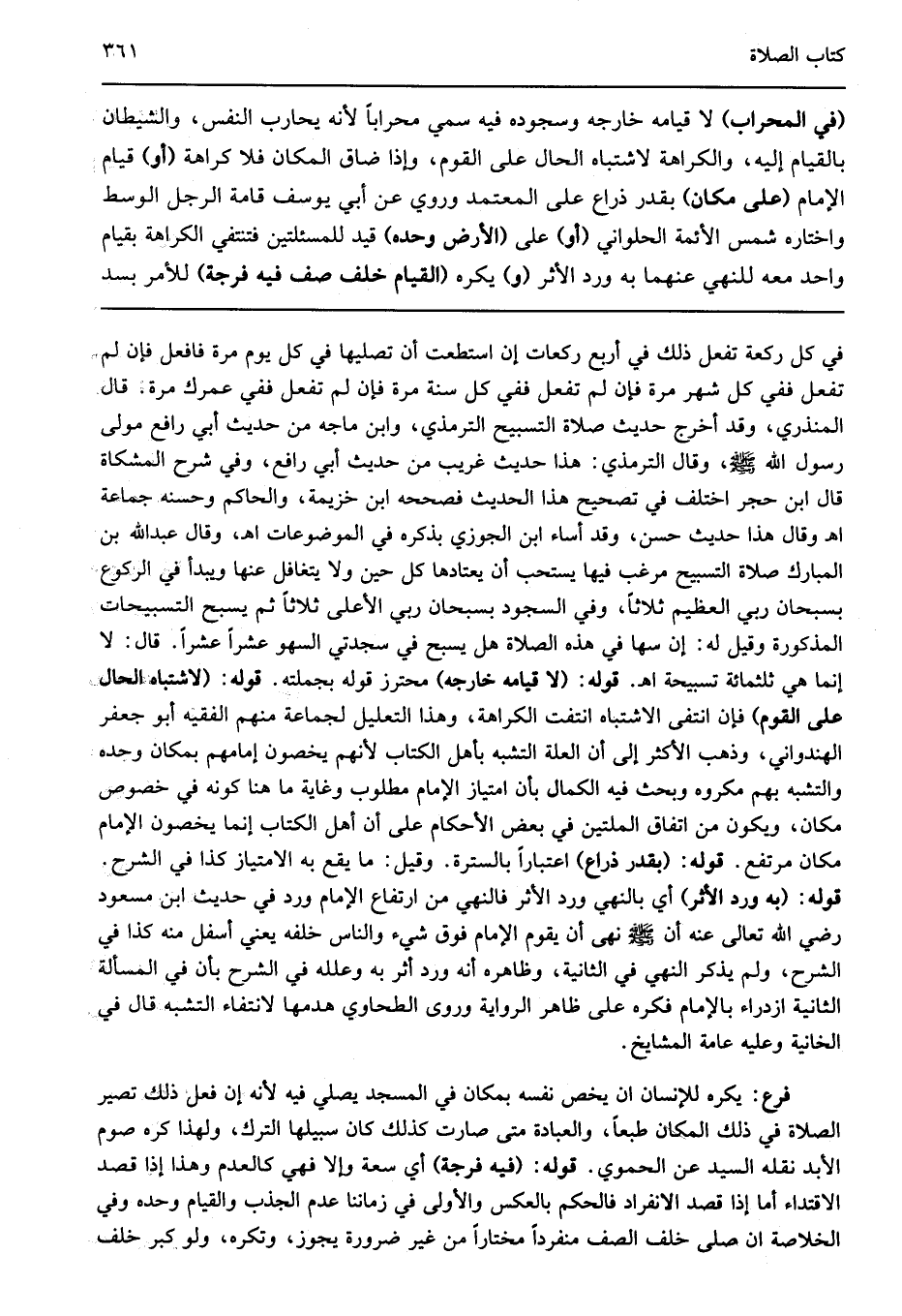 في كل ركعة تفعل ذلك في أربع ركعات إن استطعت أن تصليها في كل يوم مرة فافعل فإن لم تفعل ففي كل شهر مرة فإن لم تفعل ففي كل سنة مرة فإن لم تفعل ففي عمرك مرة" قال المنذري وقد أخرج حديث صلاة التسبيح الترمذي وابن ماجه من حديث أبي رافع مولى رسول الله صلى الله عليه وسلم وقال الترمذي هذا حديث غريب من حديث أبي رافع وفي شرح المشكاة قال ابن حجر اختلف في تصحيح هذا الحديث فصححه ابن خزيمة والحاكم وحسنه جماعة اهـ وقال هذا حديث حسن وقد أساء ابن الجوزي بذكره في الموضوعات اهـ وقال عبد الله بن المبارك صلاة التسبيح مرغب فيها يستحب أن يعتادها كل حين ولا يتغافل عنها ويبدأ في الركوع بسبحان ربي العظيم ثلاثا وفي السجود بسبحان ربي الأعلى ثلاثا ثم يسبح التسبيحات المذكورة وقيل له إن سها في هذه الصلاة هل يسبح في سجدتي السهو عشرا عشرا قال لا إنما هي ثلثمائة تسبيحة اهـ قوله: "لا قيامه خارجه" محترز قوله بجملته قوله: "لاشتباه الحال على القوم" فإن انتفى الاشتباه انتفت الكراهة وهذا التعليل لجماعة منهم الفقيه أبو جعفر الهندواني وذهب الأكثر إلى أن العلة التشبه بأهل الكتاب لأنهم يخصون إمامهم بمكان وحده والتشبه بهم مكروه وبحث فيه الكمال بأن امتياز الإمام مطلوب وغاية ما هنا كونه في خصوص مكان ويكون من اتفاق الملتين في بعض الأحكام على أن أهل الكتاب إنما يخصون الإمام مكان مرتفع قوله: "بقدر ذراع" اعتبارا بالسترة وقيل ما يقع به الامتياز كذا في الشرح قوله: "به ورد الأثر" أي بالنهي ورد الأثر فالنهي من ارتفاع الإمام ورد في حديث ابن مسعود رضي الله تعالى عنه أن صلى الله عليه وسلم نهى أن يقوم الإمام فوق شيء والناس خلفه يعني أسفل منه كذا في الشرح ولم يذكر النهي في الثانية وظاهره أنه ورد أثر به وعلله في الشرح بأن في المسألة الثانية ازدراء بالإمام فكره على ظاهر الرواية وروى الطحاوي هدمها لانتفاء التشبه قال في الخانية وعليه عامة المشايخ.