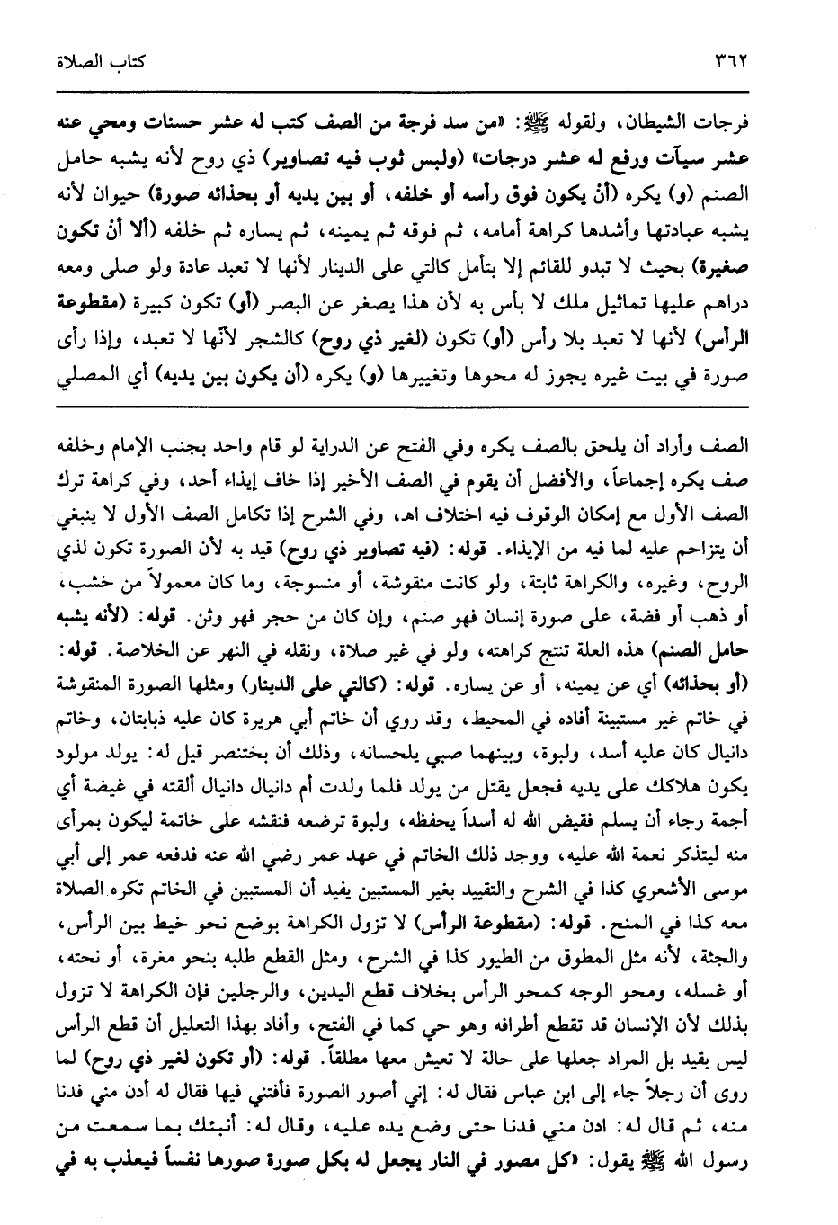 الصف وأراد أن يلحق بالصف يكره وفي الفتح عن الدراية لو قام واحد بجنب الإمام وخلفه صف يكره إجماعا والأفضل أن يقوم في الصف الأخير إذا خاف إيذاء أحد وفي كراهة ترك الصف الأول مع إمكان الوقوف فيه اختلاف اهـ وفي الشرح إذا تكامل الصف الأول لا ينبغي أن يتزاحم عليه لما فيه من الإيذاء قوله: "فيه تصاوير ذي روح" قيد به لأن الصورة تكون لذي الروح وغيره والكراهة ثابتة ولو كانت منقوشة أو منسوجة وما كان معمولا من خشب أو ذهب أو فضة على صورة إنسان فهو صنم وإن كان من حجر فهو وثن قوله: "لأنه يشبه حامل الصنم" هذه العلة تنتج كراهته ولو في غير صلاة ونقله في النهر عن الخلاصة قوله: "أو بحذائه" أي عن يمينه أو عن يساره قوله: "كالتي على الدينار" ومثلها الصورة المنقوشة في خاتم غير مستبينة أفاده في المحيط وقد روي أن خاتم أبي هريرة كان عليه ذبابتان وخاتم دانيال كان عليه أسد ولبوة وبينهما صبي يلحسانه وذلك أن يختنصر قيل له يولد مولود يكون هلاكك على يديه فجعل يقتل من يولد فلما ولدت أم دانيال دانيال ألقته في غيضة أي أجمة رجاء أن يسلم فقيض الله له أسدا يحفظه ولبوة ترضعه فنقشه على خاتمه ليكون بمرأى منه ليتذكر نعمة الله عليه ووجد ذلك الخاتم في عهد عمر رضي الله عنه فدفعه عمر إلى أبي موسى الأشعري كذا في الشرح والتقييد بغير المستبين يفيد أن المستبين في الخاتم تكره الصلاة معه كذا في المنح قوله: "مقطوعة الرأس" لا تزول الكراهة بوضع نحو خيط بين الرأس والجثة لأنه مثل المطوق من الطيور كذا في الشرح ومثل القطع طلبه بنحو مغرة أو نحته أو غسله ومحو الوجه كمحو الرأس بخلاف قطع اليدين والرجلين فإن الكراهة لا تزول بذلك لأن الإنسان قد تقطع أطرافه وهو حي كما في الفتح وأفاد بهذا التعليل أن قطع الرأس ليس بقيد بل المراد جعلها على حالة لا تعيش معها مطلقا قوله: "أو تكون لغير ذي روح" لما روى أن رجلا جاء إلى ابن عباس فقال له: إني أصور الصورة فأفتني فيها فقال له: أدن مني فدنا منه ثم قال له ادن مني فدنا حتى وضع يده عليه وقال له أنبئك بما سمعت من رسول الله صلى الله عليه وسلم يقول: "كل مصور في النار يجعل له بكل صورة صورها نفسا فيعذب به في
