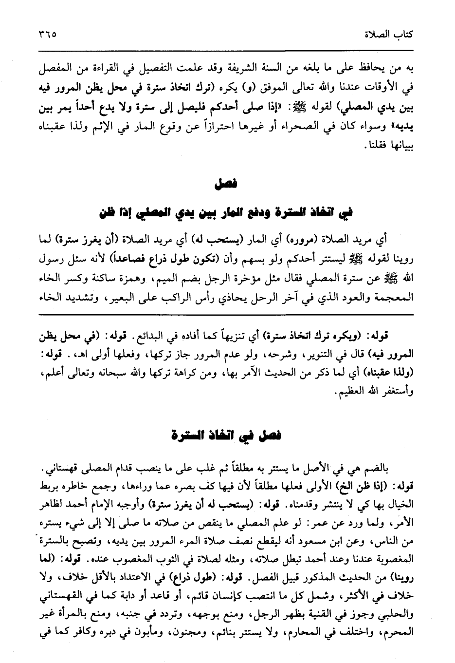 به من يحافظ على ما بلغه من السنة الشريفة وقد علمت التفصيل في القراءة من المفصل في الأوقات عندنا والله تعالى الموفق "و" يكره "ترك اتخاذ سترة في محل يظن المرور فيه بين يدي المصلي" لقوله صلى الله عليه وسلم: "إذا صلى أحدكم فليصل إلى سترة ولا يدع أحدا يمر بين يديه" وسواء كان في الصحراء أو غيرها احتراز عن وقوع المار في الإثم ولذا عقبناه ببيانها فقلنا.