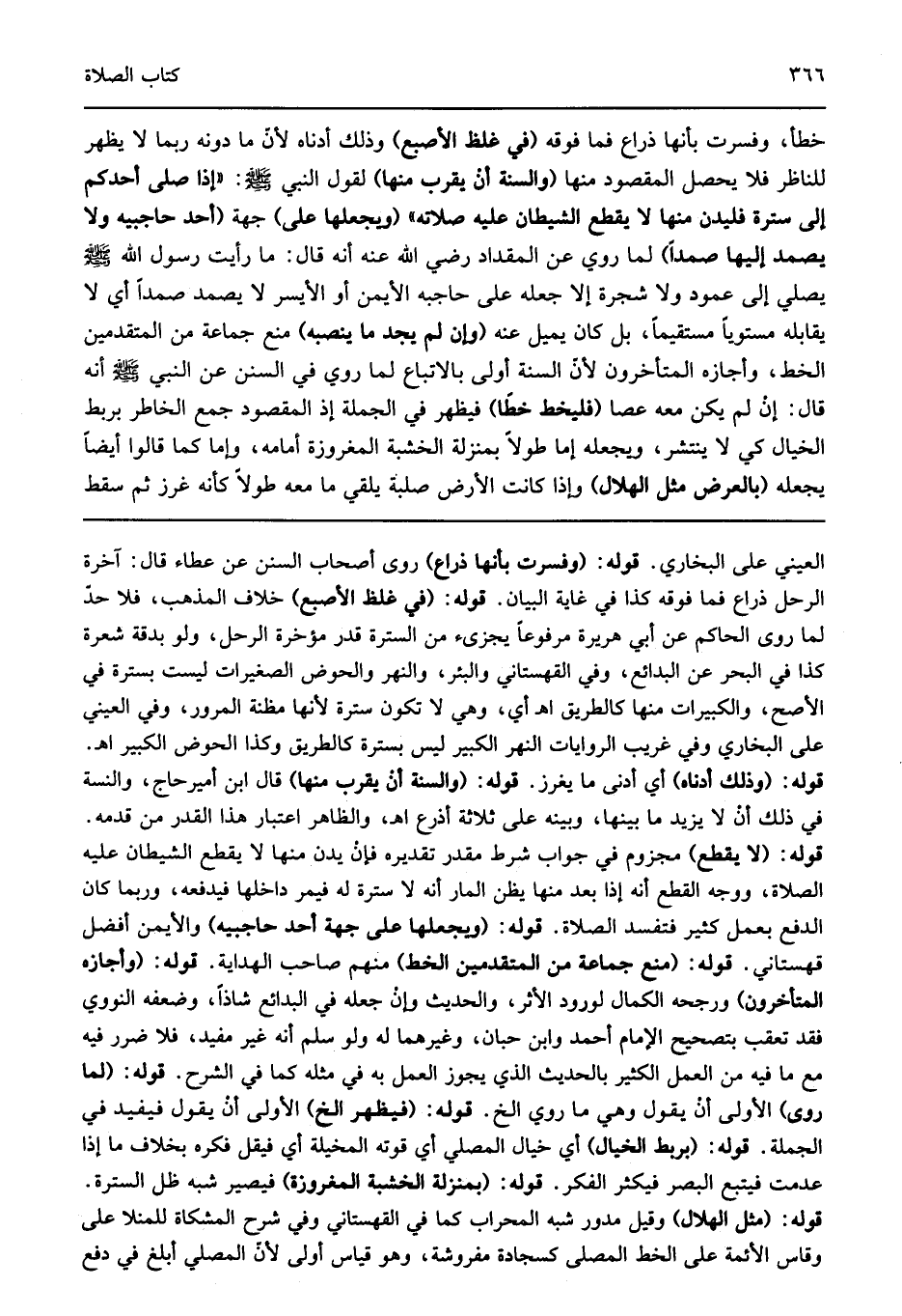 العيني على البخاري قوله: "وفسرت بأنها ذراع" روى أصحاب السنن عن عطاء قال آخرة الرحل ذراع فما فوقه كذا في غاية البيان قوله: "في غلظ الأصبع" خلاف المذهب فلا حد لما روى الحاكم عن أبي هريرة مرفوعا يجزىء من السترة قدر مؤخرة الرحل ولو بدقة شعرة كذا في البحر عن البدائع وفي القهستاني والبئر والنهر والحوض الصغيرات ليست بسترة في الأصح والكبيرات منها كالطريق اهـ أي وهي لا تكون سترة لأنها مظنة المرور وفي العيني على البخاري وفي غريب الروايات النهر الكبير ليس بسترة كالطريق وكذا الحوض الكبير اهـ قوله: "وذلك أدناه" أي أدنى ما يغرز قوله: "والسنة أن يقرب منها" قالابن أمير حاج والنسة في ذلك أن لا يزيد ما بينها وبينه على ثلاثة أذرع اهـ والظاهر اعتبار هذا القدر من قدمه قوله: "لا يقطع" مجزوم في جواب شرط مقدر تقديره فإن يدن منها لا يقطع الشيطان عليه الصلاة ووجه القطع أنه إذا بعد منها يظن المار أنه لا سترة له فيمر داخلها فيدفعه وربما كان الدفع بعمل كثير فتفسد الصلاة قوله: "ويجعلها على جهة أحد حاجبيه" والأيمن أفضل قهستاني قوله: "منع جماعة من المتقدمين الخط" منهم صاحب الهداية قوله: "وأجازه المتأخرون" ورجحه الكمال لورود الأثر والحديث وإن جعله في البدائع شاذا وضعفه النووي فقد تعقب بتصحيح الإمام أحمد وابن حبان وغيرهما له ولو سلم أنه غير مفيد فلا ضرر فيه مع ما فيه من العمل الكثير بالحديث الذي يجوز العمل به في مثله كما في الشرح قوله: "لما روى" الأولى أن يقول وهي ما روي الخ قوله: "فيظهر الخ" الأولى أن يقول فيفيد في الجملة قوله: "بربط الخيال" أي خيال المصلي أي قوته المخيلة أي فيقل فكره بخلاف ما إذا عدمت فيتبع البصر فيكثر الفكر قوله: "بمنزلة الخشبة المغروزة" فيصير شبه ظل السترة قوله: "مثل الهلال" وقيل مدور شبه المحراب كما في القهستاني وفي شرح المشكاة للمنلا على وقاس الأئمة على الخط المصلى كسجادة مفروشة وهو قياس أولى لأن المصلي أبلغ في دفع