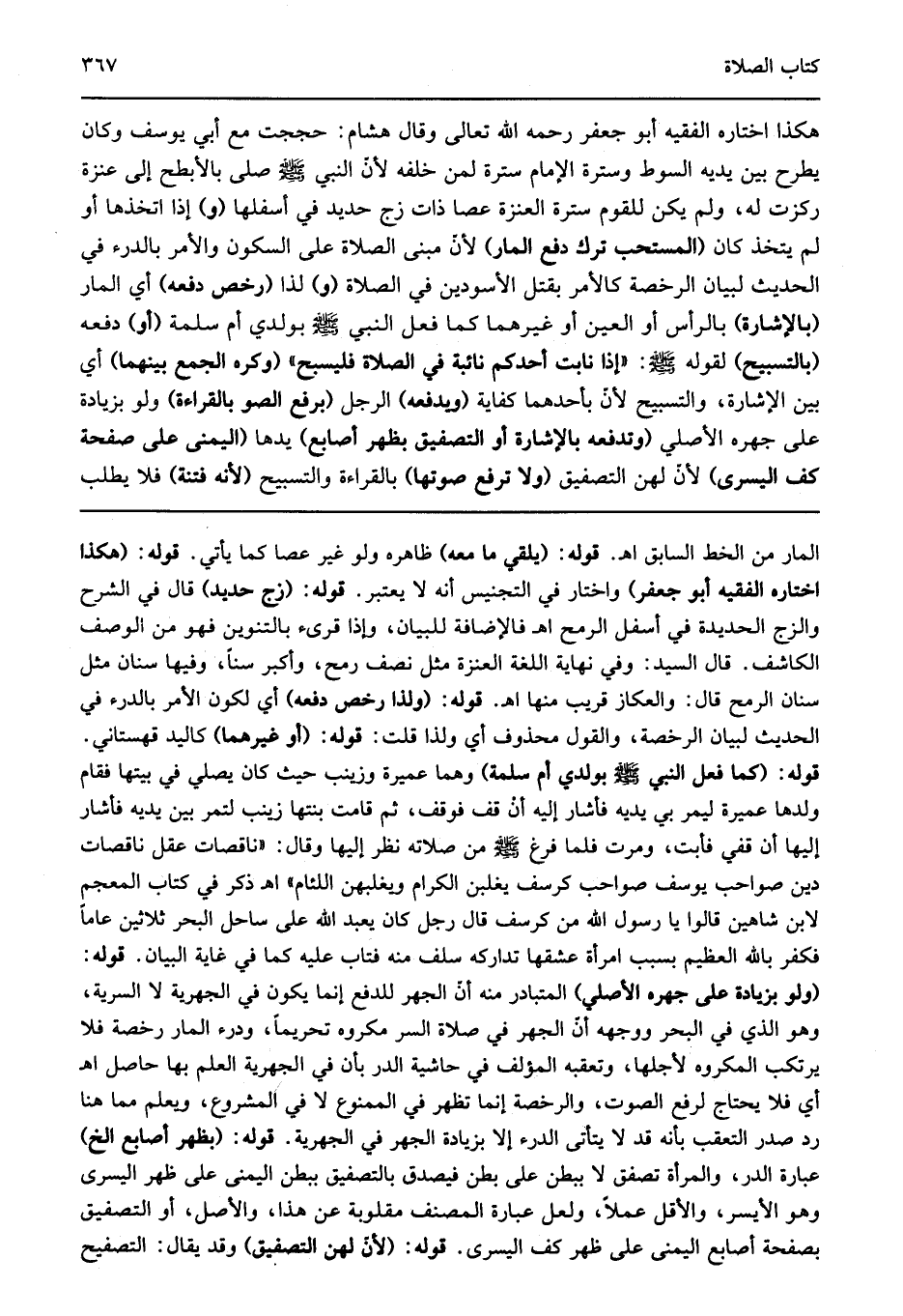 هكذا اختاره الفقيه أبو جعفر رحمه الله تعالى وقال هشام حججت مع أبي يوسف وكان يطرح بين يديه السوط وسترة الإمام سترة لمن خلفه لأن النبي صلى الله عليه وسلم صلى بالأبطح عنزة ركزت له ولم يكن للقوم سترة. العنزة عصا ذات زج حديد في أسفلها "و" إذا اتخذها أو لم يتخذ كان "المستحب ترك دفع المار" لأن مبنى الصلاة على السكون والأمر بالدرء في الحديث لبيان الرخصة كالأمر بقتل الأسودين في الصلاة "و" كذا "رخص دفعه" أي المار "بالإشارة" بالرأس أو العين أو غيرهما كما فعل النبي صلى الله عليه وسلم بولدي أم سلمة "أو" دفعه "بالتسبيح" لقوله صلى الله عليه وسلم: "إذا نابت أحدكم نائبة في الصلاة فليسبح" "وكره الجمع بينهما" أي بين الإشارة والتسبيح لأن بأحدهما كفاية "ويدفعه" الرجل "برفع الصوت بالقراءة" ولو بزيادة على جهره الأصلي "وتدفعه" المرأة "بالإشارة أو التصفيق بظهر أصابع" يدها "اليمنى على صفحة كف اليسرى" لأن لهن التصفيق "ولا ترفع صوتها" بالقراءة والتسبيح "لأنه فتنة" فلا يطلب