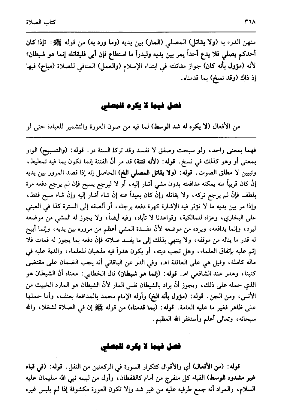 فهما بمعنى واحد ولو سبحت وصفق لا تفسد وقد تركا السنة در قوله: "والتسبيح" الواو بمعنى أو وهو كذلك في نسخ قوله: "لأنه فتنة" قد مر أن الفتنة إنما تكون بما فيه تمطيط وتبيين لا مطلق الصوت قوله: "ولا يقاتل المصلي الخ" الحاصل إنه إذا قصد المرور بين يديه إن كان قريبا منه يمكنه مدافعته بدون مشي أشار إليه أو لا ليرجع يسبح فإن لم يرجع دفعه مرة بلطف فإن لم يرجع تركه ولا يقاتله وإن كان بعيدا عنه إن شاء أشار إليه وإن شاء سبح فقط وإذا مر بين يديه ما لا تؤثر فيه الإشارة كهرة دفعه برجله أو ألصقه إلى السترة كذا في العيني على البخاري وعزاه للمالكية وقواعدنا لا تأباه وفيه أيضا ولا يجوز له المشي من موضعه ليرد وإنما يدافعه ويرده من موضعه لأن مفسدة المشي أعظم من مروره بين يديه وإنما أبيح له قدر ما يناله من موقفه ولا ينتهي بذلك إلى ما يفسد صلاته فإن دفعه بما يجوز له فمات فلا إثم عليه بإتفاق العلماء وهل تجب ديته أو يكون هدرا فيه مذهبان للعلماء والدية عليه في ماله كاملة وقيل هي على العاقلة اهـ وفي الدر عن الباقاني أنه يجب الضمان على مقتضى كتبنا وهدر عند الشافعي اهـ قوله: "إنما هو شيطان" قال الخطابي معناه أن الشيطان هو الذي حمله على ذلك ويجوز أن يراد بالشيطان نفس المار لأن الشيطان هو المارد الخبيث من الأنس ومن الجن قوله: "مؤول بأنه الخ" وأوله الإمام محمد بالمدافعة بعنف وأما حملها على ظاهر فغير ما عليه العامة قوله: "بما قدمناه" من قوله صلى الله عليه وسلم: "إن في الصلاة لشغلا" والله سبحانه وتعالى أعلم وأستغفر الله العظيم.