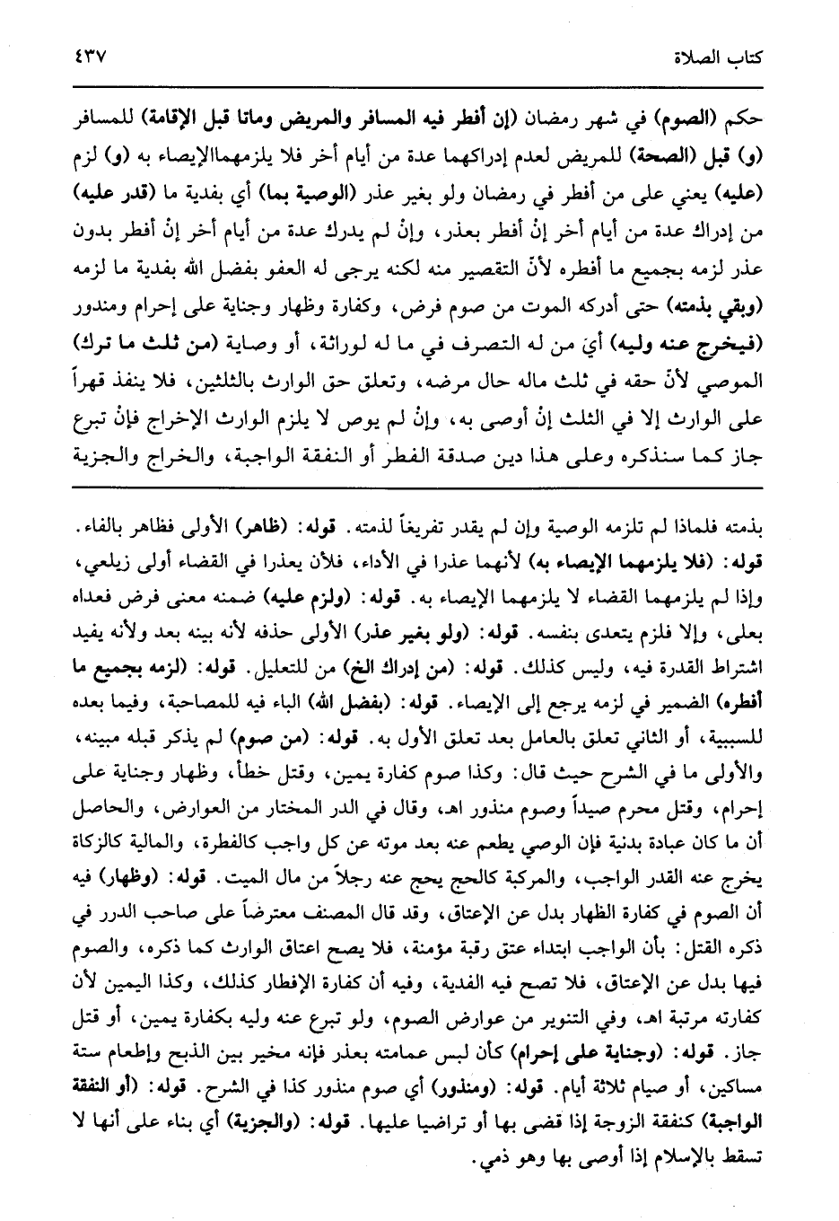 حكم "الصوم" في شهر رمضان "إن أفطر فيه المسافر والمريض وماتا قبل الإقامة" للمسافر "و" قبل "الصحة" للمريض لعدم إدراكهما عدة من أيام أخر فلا يلزمهما الإيصاء به "و" لزم "عليه" يعني على من أفطر في رمضان ولو بغير عذر "الوصية بما" أي بفدية ما "قدر عليه" من إدراك عدة من أيام أخر إن أفطر بعذر وإن لم يدرك عدة من أيام أخر إن أفطر بدون عذر لزمه بجميع ما أفطره لأن التقصير منه لكنه يرجى له العفو بفضل الله بفدية ما لزمه "وبقي بذمته" حتى أدركه الموت من صوم فرض وكفارة وظهار وجناية على إحرام ومنذور "فيخرج عنه وليه" أي من له التصرف في حاله لوراثة أو وصاية "من ثلث ما ترك" الموصي لأن حقه في ثلث ماله حال مرضه وتعلق حق الوارث بالثلثين فلا ينفذ قهرا على الوارث إلا في الثلث إن أوصى به وإن لم يوص لا يلزم الوارث الإخراج فإن تبرع جاز كما سنذكره وعلى هذا دين صدقة الفطر أو النفقة الواجبة والخراج والجزية
