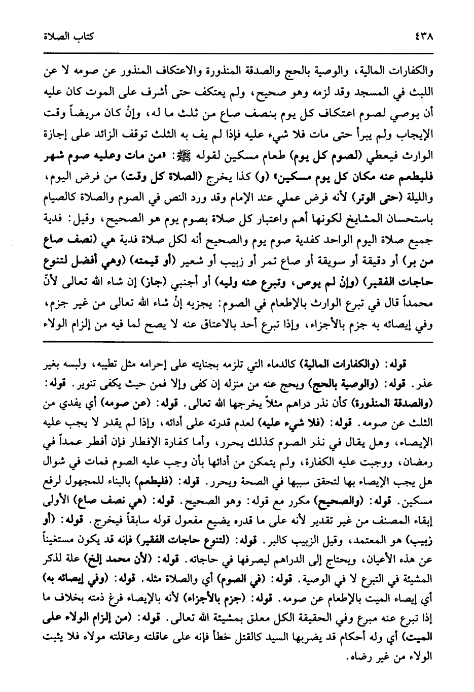 قوله: "والكفارات المالية" كالدماء التي تلزمه بجنايته على إحرامه مثل تطيبه ولبسه بغير عذر قوله: "والوصية بالحج" ويحج عنه من منزله إن كفى وإلا فمن حيث يكفى تنوير قوله: "والصدقة المنذورة" كأن نذر دراهم مثلا يخرجها الله تعالى قوله: "عن صومه" أي يفدي من الثلث عن صومه قوله: "فلا شيء عليه" لعدم قدرته على أدائه وإذا لم يقدر لا يجب عليه الإيصاء وهل يقال في نذر الصوم كذلك يحرر وأما كفارة الإفطار فأن أفطر عمدا في رمضان ووجبت عليه الكفارة ولم يتمكن من أدائها بأن وجب عليه الصوم فمات في شوال هل يجب الإيصاء بها لتحقق سببها في الصحة ويحرر قوله: "فليطعم" بالبناء للمجهول لرفع مسكين قوله: "والصحيح" مكرر مع قوله وهو الصحيح قوله: "هي نصف صاع" الأولى إبقاء المصنف من غير تقدير لأنه على ما قدره يضيع مفعول قوله سابقا فيخرج قوله: "أو زبيب" هو المعتمد وقيل الزبيب كالبر قوله: "لتنوع حاجات الفقير" فإنه قد يكون مستغينا عن هذه الأعيان ويحتاج إلى الدراهم ليصرفها في حاجاته قوله: "لأن محمد إلخ" علة لذكر المشيئة في التبرع لا في الوصية قوله: "في الصوم" أي والصلاة مثله قوله: "وفي إيصائه به" أي إيصاء الميت بالإطعام عن صومه قوله: "جزم بالأجزاء" لأنه بالإيصاء فرغ ذمته بخلاف ما إذا تبرع عنه مبرع وفي الحقيقة الكل معلق بمشيئة الله تعالى قوله: "من إلزام الولاء على الميت" أي وله أحكام قد يضربها السيد كالقتل خطأ فإنه على عاقلته وعاقلته مولاه فلا يثبت الولاء من غير رضاه.