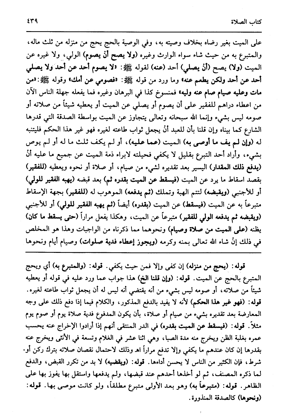 على الميت بغير رضاه بخلاف وصيته به وفي الوصية بالحج يحج من منزله من ثلث ماله والمتبرع من حيث شاء سواء الوارث وغيره "ولا يصح أن يصوم" الولي ولا غيره عن الميت "ولا" يصح "أن يصلي" أحد "عنه" لقوله صلى الله عليه وسلم: "لا يصوم أحد عن أحد ولا يصلي أحد عن أحد ولكن يطعم عنه" وما ورد من قوله صلى الله عليه وسلم: "فصومي عن أمك" وقوله صلى الله عليه وسلم: "من مات وعليه صيام صام عنه وليه" فمنسوخ كذا في البرهان وغيره فما يفعله جهلة الناس الآن من إعطاء دراهم للفقير على أن يصوم أو يصلي عن الميت أو يعطيه شيئا من صلاته أو صومه ليس بشيء وإنما الله سبحانه وتعالى يتجاوز عن الميت بواسطة الصدقة التي قدرها الشارع كما بيناه وإن قلنا بأن للعبد أن يجعل ثواب طاعته لغيره فهو غير هذا الحكم فليتنبه له "وإن لم يف ما أوصى به" الميت "عما عليه" أولم يكف ثلث ماله أو لم يوص بشيء وأراد أحد التبرع بقليل لا يكفي فحيلته لإبراء ذمة الميت عن جميع ما عليه أن "يدفع ذلك المقدار" اليسير ليسير بعد تقديره لشيء من صيام أو صلاة أو نحوه ويعطيه "للفقير" بقصد إسقاط ما يريد عن الميت "فيسقط عن الميت بقدره ثم" بعد قبضه "يهبه الفقير للولي" أو للأجنبي "ويقبضه" لتتم الهبة وتملك "ثم يدفعه" الموهوب له "للفقير" بجهة الإسقاط متبرعا به عن الميت "فيسقط" عن الميت "بقدره" أيضا "ثم يهبه الفقير للولي" أو للأجنبي "ويقبضه ثم يدفعه الولي للفقير" متبرعا عن الميت "وهكذا" يفعل مرارا "حتى يسقط ما كان" يظنه "على الميت من الصلاة والصيام" ونحوهما مما ذكرناه من الواجبات وهذا هو المخلص في ذلك إن شاء الله تعالى بمنه وكرمه "ويجوز إعطاء فدية صلوات" وصيام أيام ونحوها