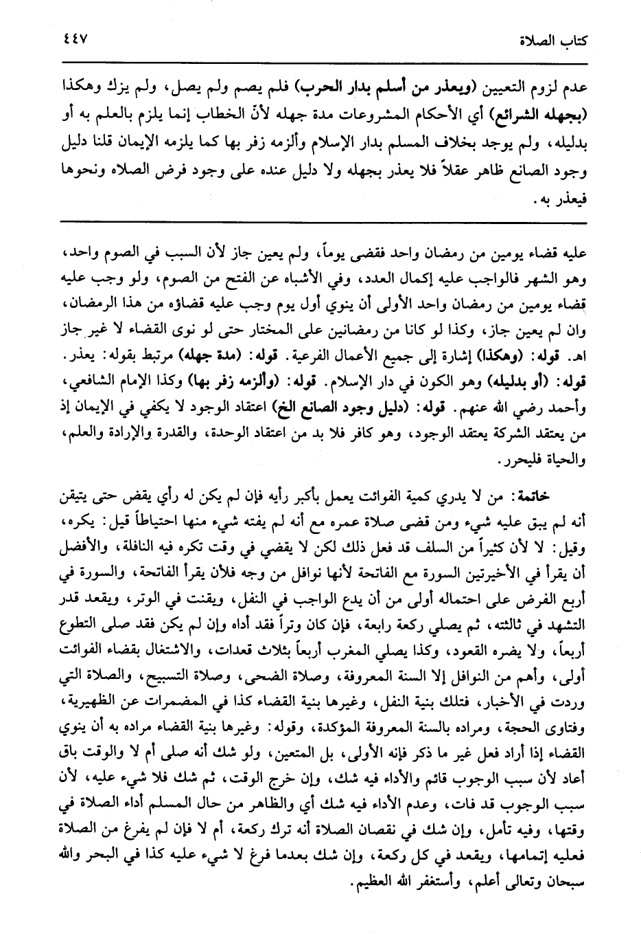 عليه قضاء يومين من رمضان واحد فقضى يوما ولم يعين جاز لأن السبب في الصوم واحد وهو الشهر فالواجب عليه إكمال العدد وفي الأشباه عن الفتح من الصوم ولو وجب عليه قضاء يومين من رمضان واحد الأولى أن ينوي أول يوم وجب عليه قضاؤه من هذا الرمضان وان لم يعين جاز وكذا لو كانا من رمضانين على المختار حتى لو نوى القضاء لا غير جاز اهـ قوله: "وهكذا " إشارة إلى جميع الأعمال الفرعية قوله: "مدة جهله" مرتبط بقوله يعذر قوله: "أو بدليله" وهو الكون في دار الإسلام قوله: "وألزمه زفر بها" وكذا الإمام الشافعي وأحمد رضي الله عنهم قوله: "دليل وجود الصانع الخ" اعتقاد الوجود لا يكفي في الإيمان إذ من يعتقد الشركة يعتقد الوجود وهو كافر فلا بد من اعتقاد الوحدة والقدرة والإرادة والعلم والحياة فليحرر.