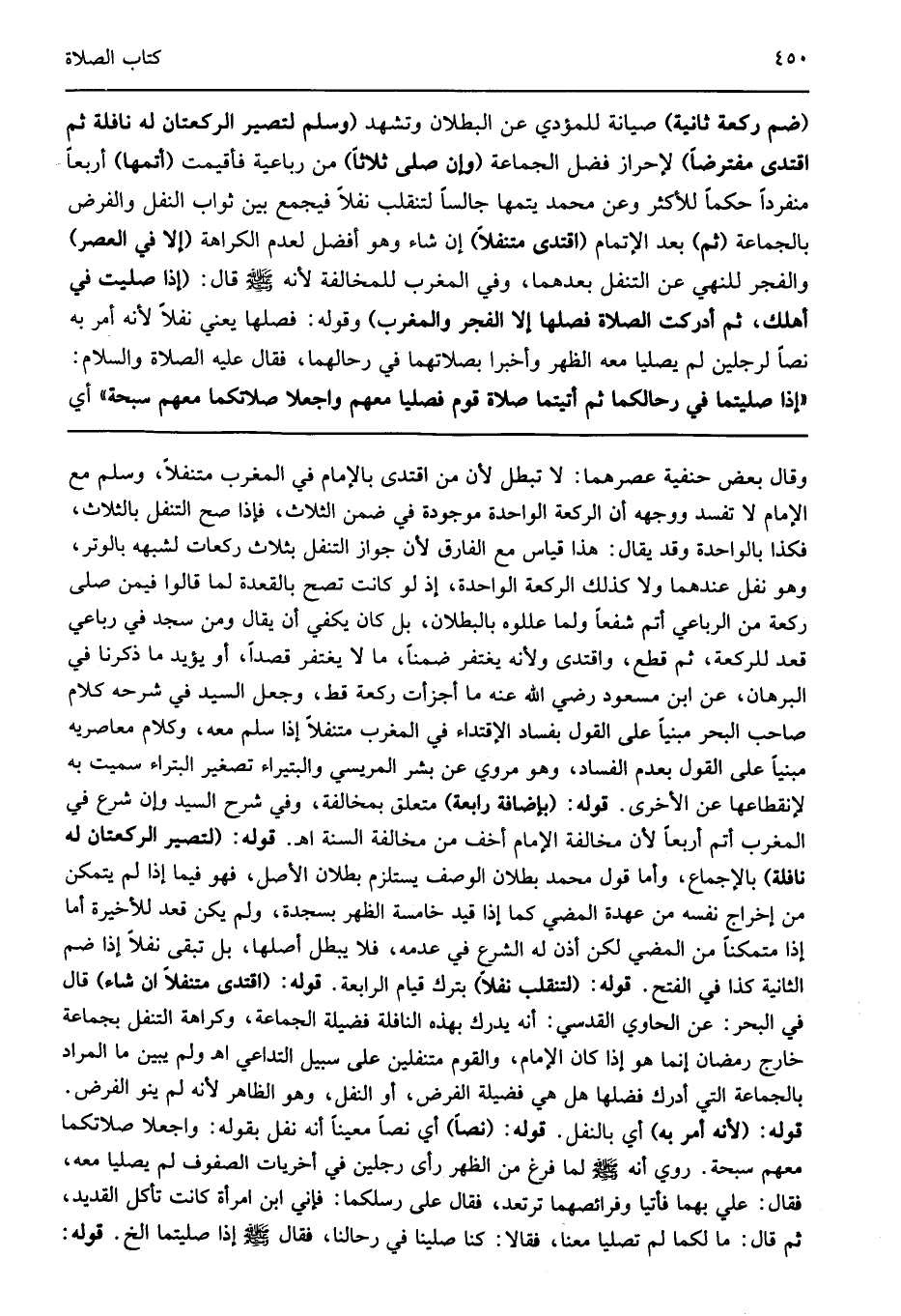 "ضم ركعة ثانية" صيانة للمؤدي عن البطلان وتشهد "وسلم لتصير الركعتان له نافلة ثم اقتدى مفترض" لإحراز فضل الجماعة "وإن صلى ثلاثا" من رباعية فأقيمت "أتمها" أربعا منفردا حكما للأكثر وعن محمد يتمها جالسا لتنقلب نفلا فيجمع بين ثواب النفل والفرض بالجماعة "ثم" بعد الإتمام "اقتدى متنفلا" إن شاء وهو أفضل لعدم الكراهة "لا في العصر" والفجر للنهي عن التنفل بعدهما وفي المغرب للمخالفة لأنه صلى الله عليه وسلم قال: "إذا صليت في أهلك ثم أدركت الصلاة فصلها إلا الفجر والمغرب" وقوله فصلها يعني نفلا لأنه أمر به نصا لرجلين لم يصليا معه الظهر وأخبرا بصلاتهما في رحالهما فقال عليه السلام: "إذا صليتما في رحالكما ثم أتيتما صلاة قوم فصليا معهم واجعلا صلاتكما معهم سبحة" أي