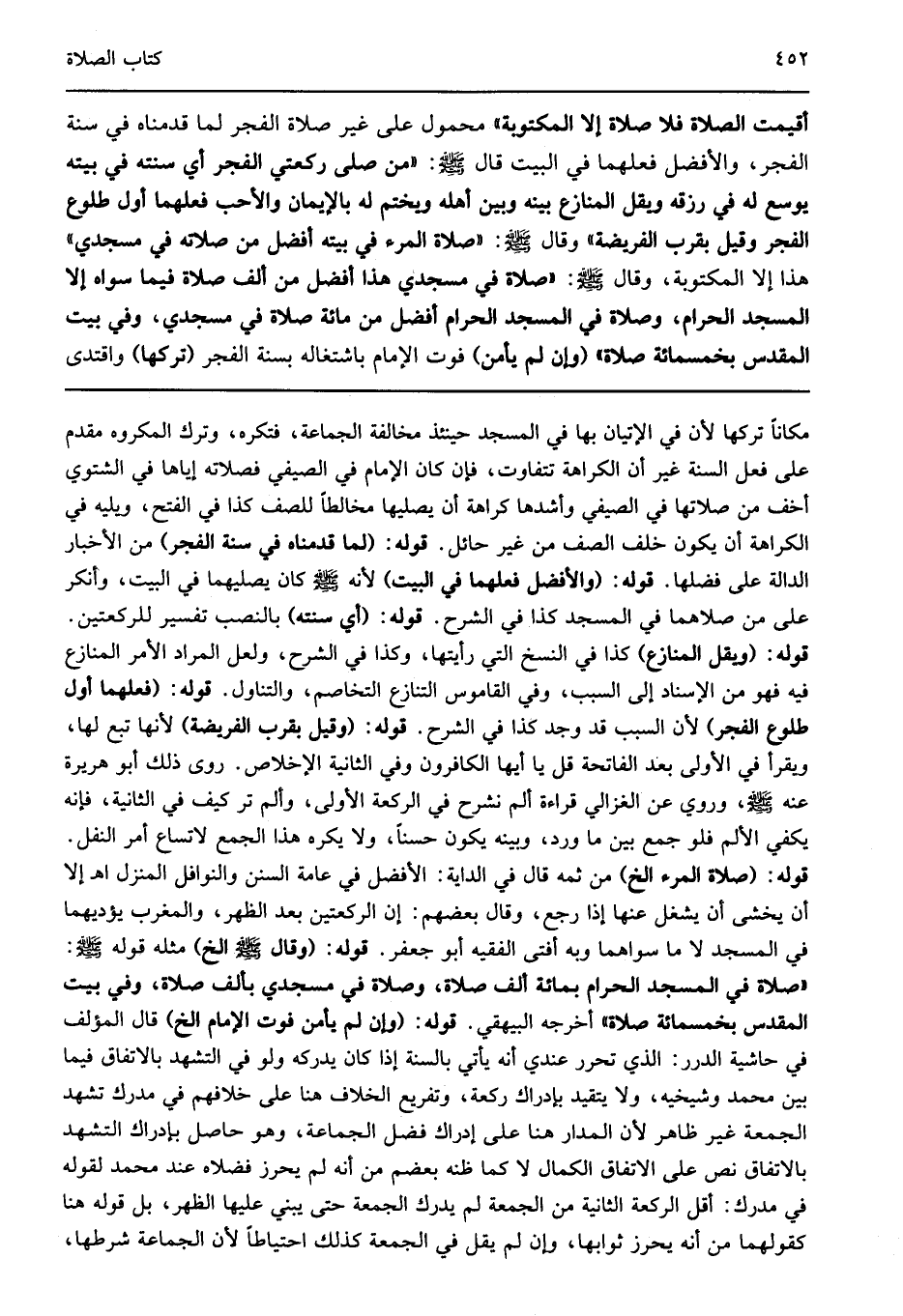 مكانا تركها لأن في الإتيان بها في المسجد حينئذ مخالفة الجماعة فتكره وترك المكروه مقدم على فعل السنة غير أن الكراهة تتفاوت فإن كان الإمام في الصيفي فصلاته إياها في الشتوي أخف من صلاتها في الصيفي وأشدها كراهة أن يصليها مخالطا للصف كذا في الفتح ويليه في الكراهة أن يكون خلف الصف من غير حائل قوله: "لما قدمناه في سنة الفجر" من الأخبار الدالة على فضلها قوله: "والأفضل فعلهما في البيت" لأنه كان يصليهما في البيت وأنكر على من صلاهما في المسجد كذا في الشرح قوله: "أي سنته" بالنصب تفسير للركعتين قوله: "ويقل المنازع" كذا في النسخ التي رأيتها وكذا في الشرح ولعل المراد الأمر المنازع فيه فهو من الإسناد إلى السبب وفي القاموس التنازع التخاصم والتناول قوله: "فعلهما أول طلوع الفجر" لأن السبب قد وجد كذا في الشرح قوله: "وقيل بقرب الفريضة" لأنها تبع لها ويقرأ في الأولى بعد الفاتحة قل يا أيها الكافرون وفي الثانية الإخلاص روى ذلك أبو هريرة عنه وروي عن الغزالي قراءة ألم نشرح في الركعة الأولى وألم تر كيف في الثانية فإنه يكفي الألم فلو جمع بين ما ورد وبينه يكون حسنا ولا يكره هذا الجمع لاتساع أمر النفل قوله: "صلاة المرء الخ" من ثمه قال في الداية الأفضل في عامة السنن والنوافل المنزل اهـ إلا أن يخشى أن يشغل عنها إذا رجع وقال بعضهم إن الركعتين بعد الظهر والمغرب يؤديهما في المسجد لا ما سواهما وبه أفتى الفقيه أبو جعفر قوله: "وقال الخ" مثله قوله صلاة في المسجد الحرام بمائة ألف صلاة وصلاة في مسجدي بألف صلاة وفي بيت المقدس بخمسمائة صلاة أخرجه البيهقي قوله: "وإن لم يأمن فوت الإمام الخ" قال المؤلف في حاشية الدرر الذي تحرر عندي أنه يأتي بالسنة إذا كان يدركه ولو في التشهد بالاتفاق فيما بين محمد وشيخيه ولا يتقيد بإدراك ركعة وتفريع الخلاف هنا على خلافهم في مدرك تشهد الجمعة غير ظاهر لأن المدار هنا على إدراك فضل الجماعة وهو حاصل بإدراك التشهد بالاتفاق نص على الاتفاق الكمال لا كما ظنه بعضم من أنه لم يحرز فضلاه عند محمد لقوله في مدرك أقل الركعة الثانية من الجمعة لم يدرك الجمعة حتى يبني عليها الظهر بل قوله هنا كقولهما من أنه يحرز ثوابها وإن لم يقل في الجمعة كذلك احتياطا لأن الجماعة شرطها