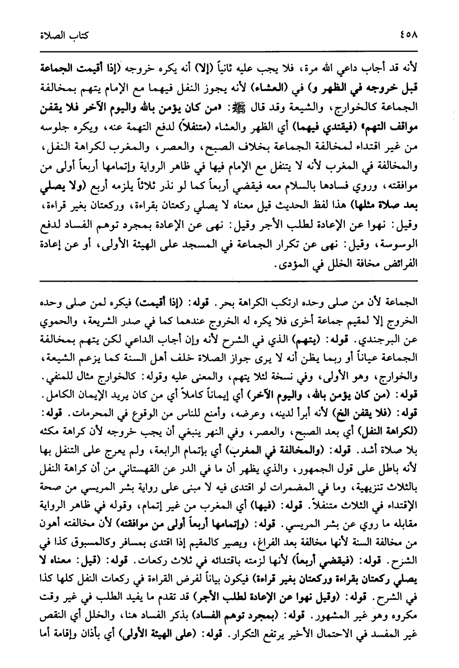 الجماعة لأن من صلى وحده ارتكب الكراهة بحر قوله: "إذا أقيمت" فيكره لمن صلى وحده الخروج إلا لمقيم جماعة أخرى فلا يكره له الخروج عندهما كما في صدر الشريعة والحموي عن البرجندي قوله: "يتهم" الذي في الشرح لأنه وإن أجاب الداعي لكن يتهم بمخالفة الجماعة عيانا أو ربما يظن أنه لا يرى جواز الصلاة خلف أهل السنة كما يزعم الشيعة والخوارج وهو الأولى وفي نسخة لئلا يتهم والمعنى عليه وقوله كالخوارج مثال للمنفي قوله: "من كان يؤمن بالله واليوم الآخر" أي إيمانا كاملا أي من كان يريد الإيمان الكامل قوله: "فلا يقفن الخ" لأنه أبرأ لدينه وعرضه وأمنع للناس من الوقوع في المحرمات قوله: "لكراهة النفل" أي بعد الصبح والعصر وفي النهر ينبغي أن يجب خروجه لأن كراهة مكثه بلا صلاة أشد قوله: "والمخالفة في المغرب" أي بإتمام الرابعة ولم يعرج على التنفل بها لأنه باطل على قول الجمهور والذي يظهر أن ما في الدر عن القهستاني من أن كراهة النفل بالثلاث تنزيهية وما في المضمرات لو اقتدى فيه لا مبنى على رواية بشر المريسي من صحة الإقتداء في الثلاث متنفلا قوله: "فيها" أي المغرب من غير إتمام وقوله في ظاهر الرواية مقابله ما روي عن بشر المريسي قوله: "وإتمامها أربعا أولى من موافقته" لأن مخالفته أهون من مخالفة السنة لأنها مخالفة بعد الفراغ ويصير كالمقيم إذا اقتدى بمسافر وكالمسبوق كذا في الشرح قوله: "فيقضي أربعا" لأنها لزمته باقتدائه في ثلاث ركعات قوله: "قيل معناه لا يصلي ركعتان بقراءة وركعتان بغير قراءة" فيكون بيانا لفرض القراءة في ركعات النفل كلها كذا في الشرح قوله: "وقيل نهوا عن الإعادة لطلب الأجر" قد تقدم ما يفيد الطلب في غير وقت مكروه وهو غير المشهور قوله: "بمجرد توهم الفساد" بذكر الفساد هنا والخلل أي النقص غير المفسد في الاحتمال الأخير يرتفع التكرار قوله: "على الهيئة الأولى" أي بأذان وإقامة أما