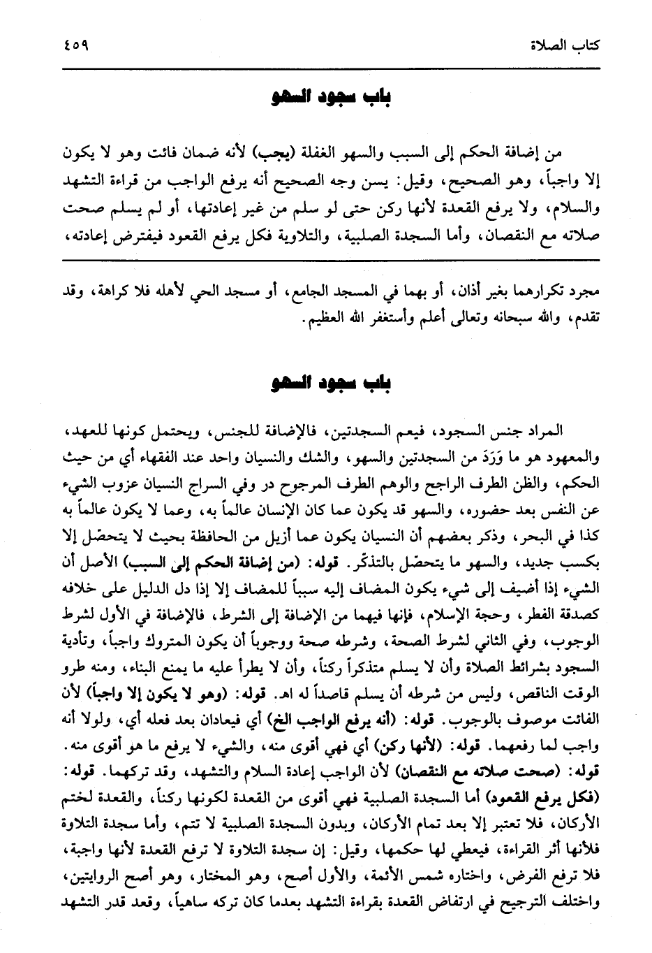 من إضافة الحكم إلى السبب والسهو الغفلة "يجب" لأنه ضمان فائت وهو لا يكون إلا واجبا وهو الصحيح وقيل يسن وجه الصحيح أنه يرفع الواجب من قراءة التشهد والسلام ويرفع القعدة لأنها ركن حتى لو سلم من غير إعادتها أو لم يسلم صحت صلاته مع النقصان وأما السجدة الصلبية والتلاوية فكل يرفع القعود فيفترض إعادته