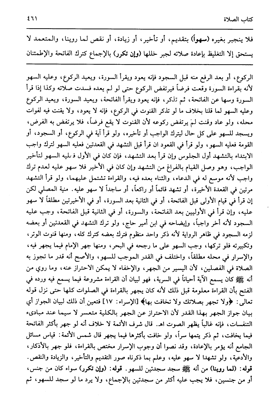 الركوع أو بعد الرفع منه قبل السجود فإنه يعود ويقرأ السورة ويعيد الركوع وعليه السهو لأنه بقراءة السورة وقعت فرضا فيرتفض الركوع حتى لو لم يعده فسدت صلاته وكذا إذا قرأ السورة وسها عن الفاتحة ثم تذكر فإنه يعود ويقرأ الفاتحة ويعيد السورة ويعيد الركوع وعليه السهو لما قلنا بخلاف ما لو تذكر القنوت في الركوع فإنه لا يعود ولا يقنت فيه لفوات محله ولو عاد وقنت لم يرتفض ركوعه لأن القنوت لا يقع فرضا فلا يرتفض به الفرض ويسجد للسهو على كل حال ليترك الواجب أو تأخيره ولو قرأ آية في الركوع أو السجود أو القومة فعليه السهو ولو قرأ في القعود ان قرأ قبل التشهد في القعدتين فعليه السهو لترك واجب الابتداء بالتشهد أول الجلوس وإن قرأ بعد التشهد فإن كان في الأول فعليه السهو لتأخير الواجب وهو وصل القيام بالفراغ من التشهد وإن كان في الأخير فلا سهو عليه لعدم ترك واجب لأنه موسع له في الدعاء والثناء بعده فيه والقراءة تشتمل عليهما ولو قرأ التشهد مرتين في القعدة الأخيرة أو تشهد قائما أو راكعا أو ساجدا لا سهو عليه منية المصلي لكن إن قرأ في قيام الأولى قبل الفاتحة أو في الثانية بعد السورة أو في الأخيرتين مطلقالا سهو عليه وإن قرأ في الأوليين بعد الفاتحة والسورة أو في الثانية قبل الفاتحة وجب عليه السجود لأنه أخر واجبا وإيضاحه في ابن أمير حاج ولو ترك التشهد في القعدتين أو بعضه لزمه السجود في ظاهر الرواية لأنه ذكر واحد منظوم فترك بعضه كترك كله ومنها قنوت الوتر وتكبيرته فلو تركها وجب السهو على ما رجحه في البحر ومنها جهر الإمام فيما يجهر فيه والإسرار في محله مطلقا واختلف في القدر الموجب للسهو والأصح أنه قدر ما تجوز به الصلاة في الفصلين لأن اليسير من الجهر والإخفاء لا يمكن الاحتراز عنه وما روي من أنه كان يسمع الآية أحيانا في السرية فهو لبيان أن القراءة مشروعة فيما يسمع فيه ورده في الفتح بأن القراءة معلومة قبل ذلك لأنه كان يجهر بالقراءة في الصلوات كلها حتى نزل قوله تعالى: {وَلا تَجْهَرْ بِصَلاتِكَ وَلا تُخَافِتْ بِهَا} [الإسراء: 110] فتعين أن ذلك لبيان الجواز أي بيان جواز الجهر بهذا القدر لأن الاحتراز عن الجهر بالكلية متعسر لا سيما عند مبادىء التنفسات فإنه غالبا يظهر الصوت اهـ قال شرف الأئمة لا خلاف أنه لو جهر بأكثر الفاتحة فيما يخافت ثم ذكر يتمها سرا ولو خافت بأكثرها فيما يجهر قال شمس الأئمة قياس مسائل الجامع أنه يؤمر بالإعادة وقد نصوا أن وجوب الإسرار مختص بالقراءة فلو جهر بالأذكار والأدعية ولو تشهدا لا سهو عليه وعلم بما ذكرناه صور التقديم والتأخير والزيادة والنقص قوله: "لما روينا" من أنه سجد سجدتين للسهو قوله: "وإن تكرر" سواء كان من جنس أو من جنسين فلا يجب عليه أكثر من سجدتين بالإجماع ولا يرد ما لو سجد للسهو ثم