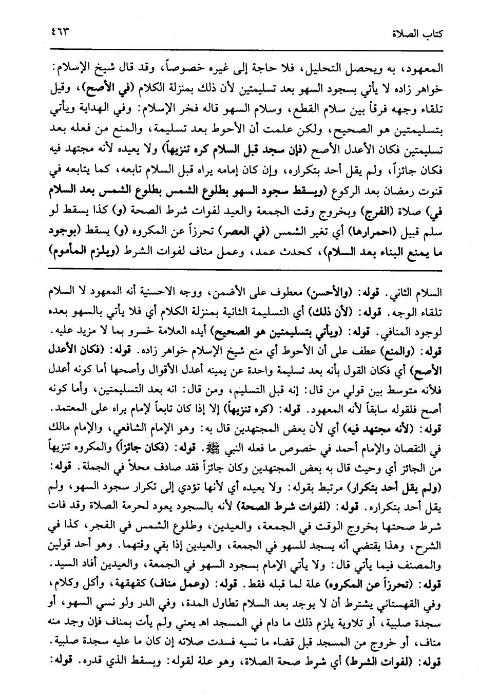 السلام الثاني قوله: "والأحسن" معطوف على الأضمن ووجه الاحسنية أنه المعهود لا السلام تلقاء الوجه قوله: "لأن ذلك" أي التسليمة الثانية بمنزلة الكلام أي فلا يأتي بالسهو بعده لوجود المنافي قوله: "ويأتي بتسليمتين هو الصحيح" أيده العلامة خسرو بما لا مزيد عليه قوله: "والمنع" عطف على أن الأحوط أي منع شيخ الإسلام خواهر زاده قوله: "فكان الأعدل الأصح" أي فكان القول بأنه بعد تسليمة واحدة عن يمينه أعدل الأقوال وأصحها أما كونه أعدل فلأنه متوسط بين قولي من قال انه قبل التسلمي ومن قال انه بعد التسليمتين وأما كونه أصح فلقوله سابقا لأنه المعهود قوله: "كره تنزيها" إلا إذا كان تابعا لإمام يراه على المعتمد قوله: "لأنه مجتهد فيه" أي لأن بعض المجتهدين قال به وهو الإمام الشافعي والإمام مالك في النقصان والإمام أحمد في خصوص ما فعله النبي قوله: "فكان جائزا" والمكروه تنزيها من الجائز أي وحيث قال به بعض المجتهدين وكان جائزا فقد صادف محلا في الجملة قوله: "ولم يقل أحد بتكرار" مرتبط بقوله ولا يعيده أي لأنها تؤدي إلى تكرار سجود السهو ولم يقل أحد بتكراره قوله: "لفوات شرط الصحة" لأنه بالسجود يعود لحرمة الصلاة وقد فات شرط صحتها بخروج الوقت في الجمعة والعيدين وطلوع الشمس في الفجر كذا في الشرح وهذا يقتضي أنه يسجد للسهو في الجمعة والعيدين إذا بقي وقتهما وهو أحد قولين والمصنف فيما يأتي قال ولا يأتي الإمام بسجود السهو في الجمعة والعيدين أفاد السيد قوله: "تحرزا عن المكروه" علة لما قبله فقط قوله: "وعمل مناف" كقهقهة وأكل وكلام وفي القهستاني يشترط أن لا يوجد بعد السلام تطاول المدة وفي الدر ولو نسي السهو أو سجدة صلبية أو تلاوية يلزم ذلك ما دام في المسجد اهـ يعني ولم يأت بمناف فإن وجد منه مناف أو خروج من المسجد قبل قضاء ما نسيه فسدت صلاته إن كان ما عليه سجدة صلبية قوله: "لفوات الشرط" أي شرط صحة الصلاة وهو علة لقوله وبسقط الذي قدره قوله: