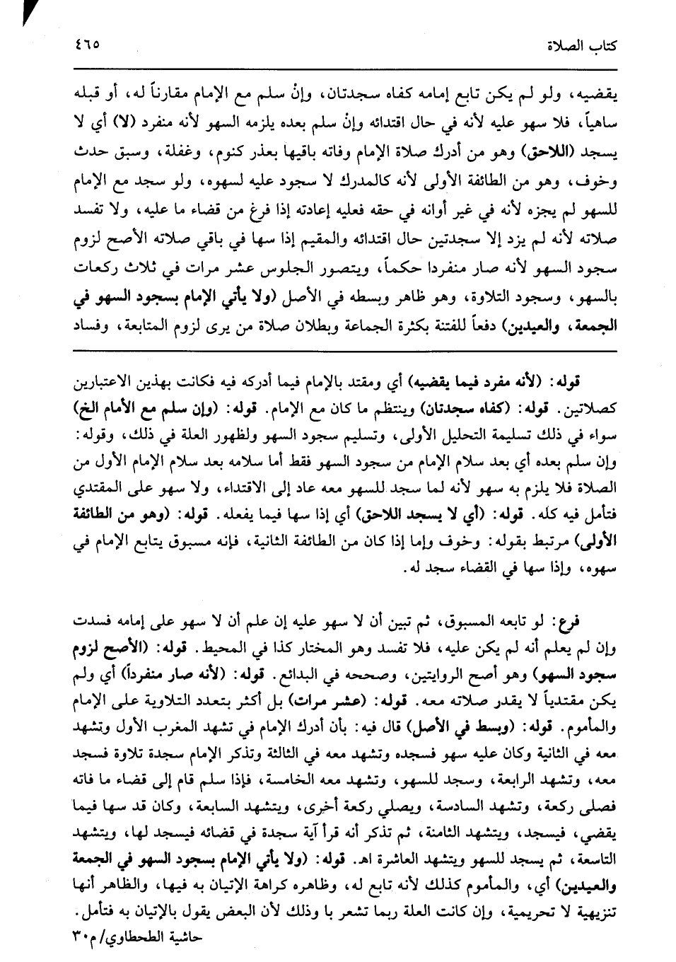 يقضيه ولو لم يكن تابع إمامه كفاه سجدتان وإن سلم مع الإمام مقرنا له أو قبله ساهيا فلا سهو عليه لأنه في حال اقتدائه وإن سلم بعده يلزمه السهو لأنه منفرد "لا" أي لا يسجد "اللاحق" وهو من أدرك أول صلاة الإمام وفاته باقيها بعذر كنوم وغفلة وسبق حدث وخوف وهو من الطائفة الأولى لأنه كالمدرك لا سجود عليه لسهوه ولو سجد مع الإمام للسهو لم يجزه لأنه في غير أوانه في حقه فعليه إعادته إذا فرغ من قضاء ما عليه ولا تفسد صلاته لأنه لم يزد إلا سجدتين حال اقتدائه. والمقيم إذا سها في باقي صلاته الأصح لزوم سجود السهو لأنه صار منفردا حكما ويتصور الجلوس عشر مرات في ثلاث ركعات بالسهو وسجود التلاوة وهو ظاهر وبسطه في الأصل "ولا يأتي الإمام بسجود. السهو في الجمعة والعيدين" دفعا للفتنة بكثرة الجماعة وبطلان صلاة من يرى لزوم المتابعة وفساد