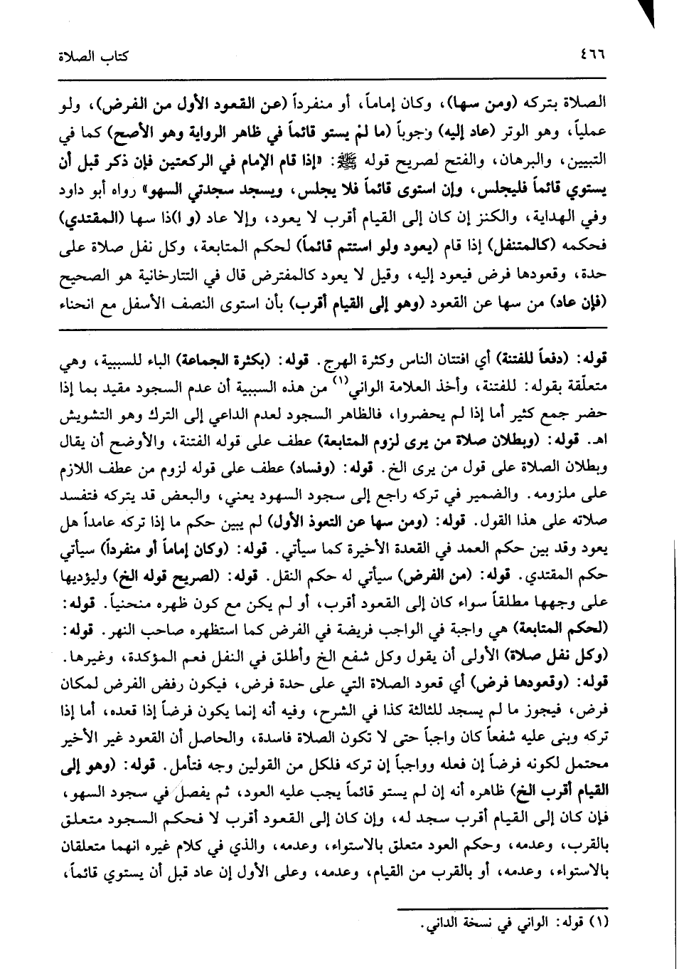 قوله: "دفعا للفتنة" أي افتتان الناس وكثرة الهرج قوله: "بكثرة الجماعة" الباء للسببية وهي متعلقة بقوله للفتنة وأخذ العلامة الواني1 من هذه السببية أن عدم السجود مقيد بما إذا حضر جمع كثير أما إذا لم يحضروا فالظاهر السجود لعدم الداعي إلى الترك وهو التشويش اهـ قوله: "وبطلان صلاة من يرى لزوم المتابعة" عطف على قوله الفتنة والأوضح أن يقال وبطلان الصلاة على قول من يرى الخ قوله: "وفساد" عطف على قوله لزوم من عطف اللازم على ملزومه والضمير في تركه راجع إلى سجود السهود يعني والبعض قد يتركه فتفسد صلاته على هذا القول قوله: "ومن سها عن القعود الأول" لم يبين حكم ما إذا تركه عامدا هل يعود وقد بين حكم العمد في القعدة الأخيرة كما سيأتي قوله: "وكان إماما أو منفردا" سيأتي حكم المقتدي قوله: "من الفرض" سيأتي له حكم النقل قوله: "لصريح قوله الخ" وليؤديها على وجهها مطلقا سواء كان إلى القعود أقرب أو لم يكن مع كون ظهره منحنيا قوله: "لحكم المتابعة" هي واجبة في الواجب فريضة في الفرض كما استظهره صاحب النهر قوله: "وكل نفل صلاة" الأولى أن يقول وكل شفع الخ وأطلق في النفل فعم المؤكدة وغيرها قوله: "وقعودها فرض" أي قعود الصلاة التي على حدة فرض فيكون رفض الفرض لمكان فرض فيجوز ما لم يسجد للثالثة كذا في الشرح وفيه أنه إنما يكون فرضا إذا قعده أما إذا تركه وبنى عليه شفعا كان واجبا حتى لا تكون الصلاة فاسدة والحاصل أن القعود غير الأخير محتمل لكونه فرضا إن فعله وواجبا إن تركه فلكل من القولين وجه فتأمل قوله: "وهو إلى القيام أقرب الخ" ظاهره أنه إن لم يستو قائما يجب عليه العود ثم يفصل في سجود السهو فإن كان إلى القيام أقرب سجد له وإن كان إلى القعود أقرب لا فحكم السجود متعلق بالقرب وعدمه وحكم العود متعلق بالاستواء وعدمه والذي في كلام غيره انهما متعلقان بالاستواء وعدمه أو بالقرب من القيام وعدمه وعلى الأول إن عاد قبل أن يستوي قائما