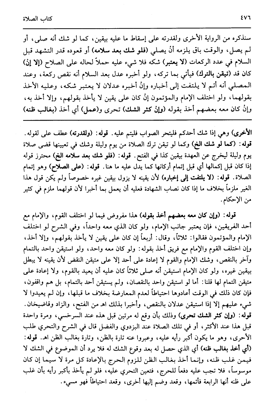 سنذكره من الرواية الأخرى ولقدرته على إسقاط ما عليه بيقين كما لو شك أنه صلى أولم يصل والوقت باق يلزمه أن يصلي "فلو شك بعد سلامه" أو قعوده قدر التشهد قبل السلام في عدد الركعات "لا يعتبر" شكه فلا شيء عليه حملا لحاله على الصلاح "إلا إن" كان قد "تيقن بالترك" فيأتي بما تركه ولو أخبره عدل بعد السلام أنه نقص ركعة وعند المصلي أنه أتم لا يلتفت إلى إخباره ولو أخبره عدلان لا يعتبر شكه وعليه الأخذ بقولهما ولو اختلف الإمام والمؤتمون إن كان على يقين لا يأخذ بقولهم وإلا أخذ به وإن كان معهم بعضهم أخذ بقوله "وإن كثر الشك" تحرى و "عمل" أي أخذ "بغالب ظنه"