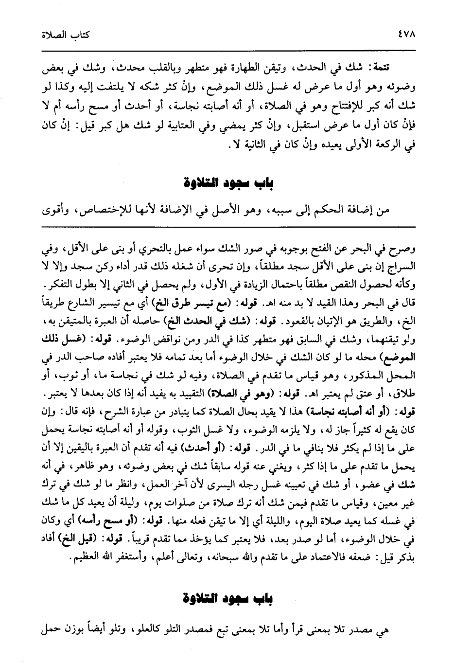 وصرح في البحر عن الفتح بوجوبه في صور الشك سواء عمل بالتحري أو بنى على الأقل وفي السراج إن بنى على الأقل سجد مطلقا وإن تحرى أن شغله ذلك قدر أداء ركن سجد وإلا لا وكأنه لحصول النقص مطلقا باحتمال الزيادة في الأول ولم يحصل في الثاني إلا بطول التفكر قال في البحر وهذا القيد لا بد منه اهـ قوله: "مع تيسر طرق الخ" أي مع تيسير الشارع طريقا الخ والطريق هو الإتيان بالقعود قوله: "شك في الحدث الخ" حاصله أن العبرة بالمتيقن به ولو تيقنهما وشك في السابق فهو متطهر كذا في الدر ومن نواقض الوضوء قوله: "غسل ذلك الموضع" محله ما لو كان الشك في خلال الوضوء أما بعد تمامه فلا يعتبر أفاده صاحب الدر في المحل المذكور وهو قياس ما تقدم في الصلاة وفيه لو شك في نجاسة ما أو ثوب أو طلاق أو عتق لم يعتبر اهـ قوله: "وهو في الصلاة" التقييد به يفيد أنه إذا كان بعدها لا يعتبر قوله: "أو أنه أصابته نجاسة" هذا لا يقيد بحال الصلاة كما يتبادر من عبارة الشرح فإنه قال وإن كان يقع له كثيراجاز له ولا يلزمه الوضوءولا غسل الثوب وقوله أوأنه أصابته نجاسة يحمل على ما إذا لم يكثر فلا ينافي ما في الدر قوله: "أو أحدث" فيه أنه تقدم أن العبرة باليقين إلا أن يحمل ما تقدم على ما إذا كثر ويغني عنه قوله سابقا شك في بعض وضوئه وهو ظاهر في أنه شك في عضو أو شك في تعيينه غسل رجله اليسرى لأن آخر العمل وانظر ما لو شك في ترك غير معين وقياس ما تقدم فيمن شك أنه ترك صلاة من صلوات يوم وليلة أن يعيد كل ما شك في غسله كما يعيد صلاة اليوم والليلة أي إلا ما تيقن فعله منها قوله: "أو مسح رأسه" أي وكان في خلال الوضوء أما لو صدر بعد فلا يعتبر كما يؤخذ مما تقدم قريبا قوله: "قيل الخ" أفاد بذكر قيل ضعفه فالاعتماد على ما تقدم والله سبحانه وتعالى أعلم وأستغفر الله العظيم.
