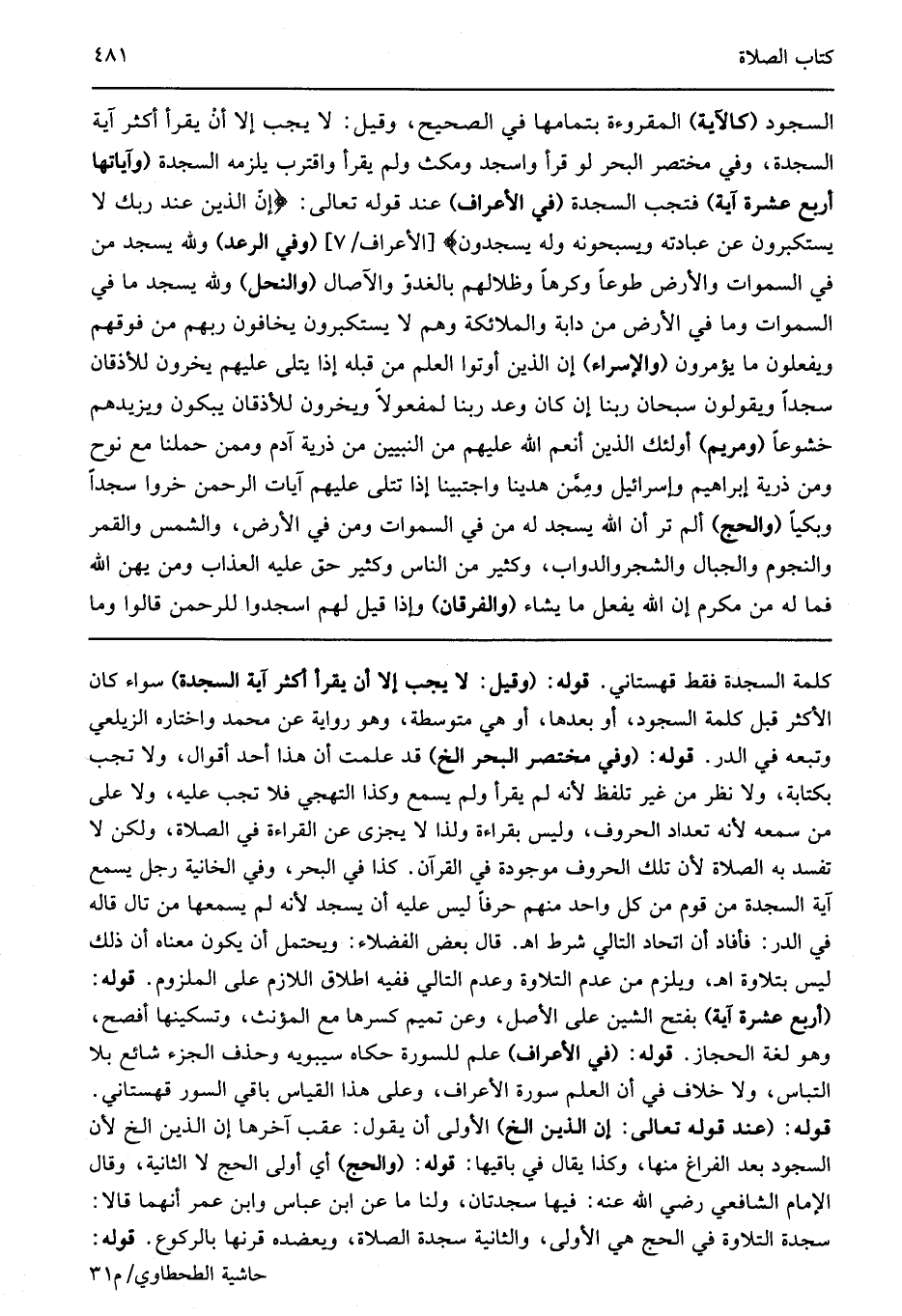 السجود "كالآية" المقروءة بتمامها "في الصحيح" وقيل لا يجب إلا أن يقرأ أكثر آية السجدة وفي مختصر البحر لو قرأ وسجد وسكت ولم يقرأ واقترب يلزمه السجدة "وآياتها أربع عشر آية" فتجب السجدة "في الأعراف" عند قوله تعالى: {إِنَّ الَّذِينَ عِنْدَ رَبِّكَ لا يَسْتَكْبِرُونَ عَنْ عِبَادَتِهِ وَيُسَبِّحُونَهُ وَلَهُ يَسْجُدُونَ} [لأعراف: 206] "وفي الرعد " ولله يسجد من في السماوات والأرض طوعا وكرها وظلالهم بالغدو والآصال" "والنحل" "ولله يسجد ما في السماوات وما في الأرض من دابة والملائكة وهم لا يستكبرون يخافون ربهم من فوقهم ويفعلون ما يؤمرون "والإسراء" إن الذين أوتوا العلم من قبله إذا يتلى عليهم يخرون للأذقان سجدا ويقولون سبحان ربنا إن كان وعد ربنا لمفعولا ويخرون للأذقان يبكون ويزيدهم خشوعا" "ومريم" "أولئك أنعم الله عليهم من النبيين من ذرية آدم وممن حملنا مع نوح ومن ذرية إبراهيم وإسرائيل وممن هدينا واجتبينا إذا تتلى عليهم آيات الرحمن خروا سجدا وبكيا" "والحج" "ألم أن الله يسجد له من في السماوات ومن في الأرض والشمس والقمر والنجوم والجبال والشجر والدواب وكثير من الناس وكثير حق عليه العذاب ومن يهن الله فما له من مكرم إن الله يفعل ما يشاء" "والفرقان" وإذا قيل لهم اسجدوا للرحمن قالوا: وما