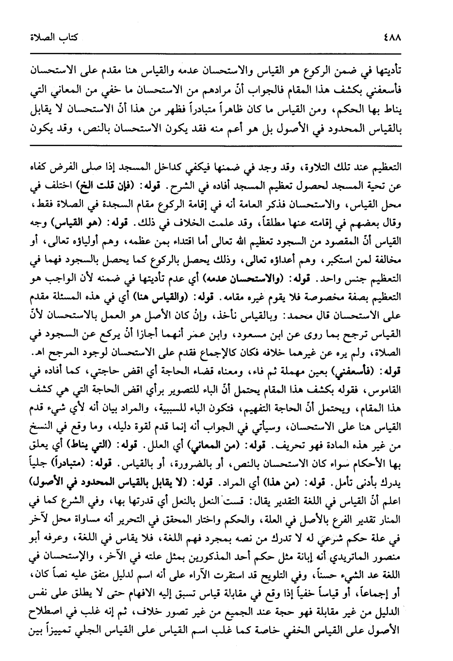 تأديتها في ضمن الركوع وهو القياس والاستحسان عدمه والقياس هنا مقدم على الاستحسان فاستغنى بكشف هذا المقام. فالجواب أن مرادهم من الاستحسان ما خفي من المعاني التي يناط بها الحكم ومن القياس ما كان ظاهرا متبادرا فظهر من هذا أن الاستحسان لا يقابل بالقياس المحدود في الأصول بل هو أعم منه فقد يكون الاستحسان بالنص وقد يكون