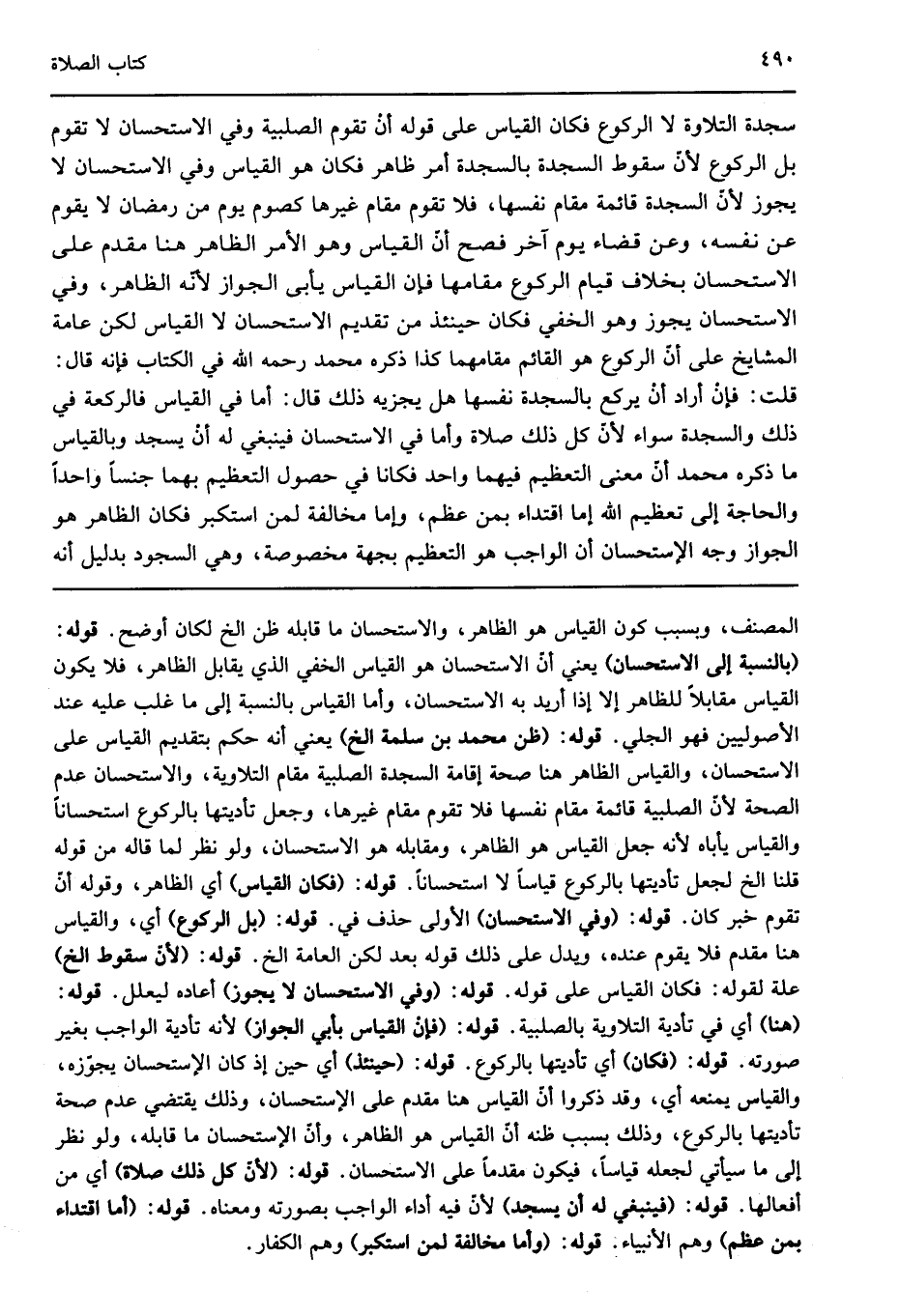 المصنف وبسبب كون القياس هو الظاهر والاستحسان ما قابله ظن الخ لكان أوضح قوله: "بالنسبة إلى الاستحسان" يعني أن الاستحسان هو القياس الخفي الذي يقابل الظاهر فلا يكون القياس مقابلا للظاهر إلا إذا أريد به الاستحسان وأما القياس بالنسبة إلى ما غلب عليه عند الأصوليين فهو الجلي قوله: "ظن محمد بن سلمة الخ" يعني أنه حكم بتقديم القياس على الاستحسان والقياس الظاهر هنا صحة إقامة السجدة الصلبية مقام التلاوية والاستحسان عدم الصحة لأن الصلبية قائمة مقام نفسها فلا تقوم مقام غيرها وجعل تأديتها بالركوع استحسانا والقياس يأباه لأنه جعل القياس هو الظاهر ومقابله هو الاستحسان ولو نظر لما قاله من قوله قلنا الخ لجعل تأديتها بالركوع قياسا لا استحسانا قوله: "فكان القياس" أي الظاهر وقوله أن تقوم خبر كان قوله: "وفي الاستحسان" الأولى حذف في قوله: "بل الركوع" أي والقياس هنا مقدم فلا يقوم عنده ويدل على ذلك قوله بعد لكن العامة الخ قوله: "لأن سقوط الخ" علة لقوله فكان القياس على قوله قوله: "وفي الاستحسان لا يجوز" أعاده ليعلل قوله: "هنا" أي في تأدية التلاوية بالصلبية قوله: "فإن القياس بأبي الجواز" لأنه تأدية الواجب بغير صورته قوله: "فكان" أي تأديتها بالركوع قوله: "حينئذ" أي حين إذ كان الإستحسان يجوزه والقياس يمنعه أي وقد ذكروا أن القياس هنا مقدم على الإستحسان وذلك يقتضي عدم صحة تأديتها بالركوع وذلك بسبب ظنه أن القياس هو الظاهر وأن الإستحسان ما قابله ولو نظر إلى ما سيأتي لجعله قياسا فيكون مقدما على الاستحسان قوله: "لأن كل ذلك صلاة" أي من أفعالها قوله: "فينبغي له أن يسجد" لأن فيه أداء الواجب بصورته ومعناه قوله: "أما اقتداء بمن عظم" وهم الأنبياء قوله: "وأما مخالفة لمن استكبر" وهم الكفار