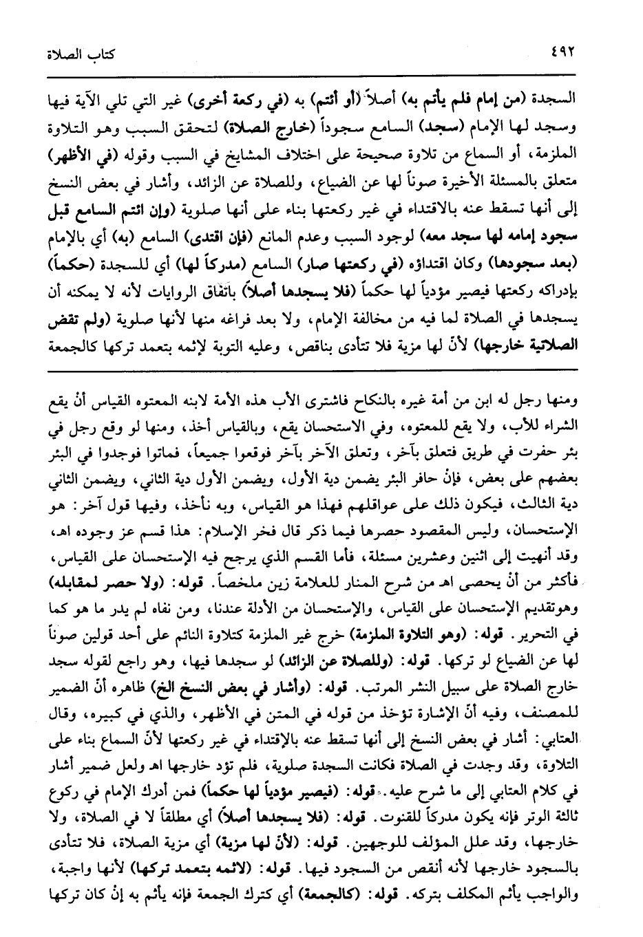 ومنها رجل له ابن من أمة غيره بالنكاح فاشترى الأب هذه الأمة لابنه المعتوه القياس أن يقع الشراء للأب ولا يقع للمعتوه وفي الاستحسان يقع وبالقياس أخذ ومنها لو وقع رجل في بئر حفرت في طريق فتعلق بآخر وتعلق الآخر بآخر فوقعوا جميعا فماتوا فوجدوا في البئر بعضهم على بعض فإن حافر البئر يضمن دية الأول ويضمن الأول دية الثاني ويضمن الثاني دية الثالث فيكون ذلك على عواقلهم فهذا هو القياس وبه نأخذ وفيها قول آخر هو الإستحسان وليس المقصود حصرها فيما ذكر قالفخر الإسلام هذا قسم عز وجوده اهـ وقد أنهيت إلى اثنين وعشرين مسئلة فأما القسم الذي يرجح فيه الإستحسان على القياس فأكثر من أن يحصى اهـ من شرح المنار للعلامة زين ملخصا قوله: "ولا حصر لمقابله" وهوتقديم الإستحسان على القياس والإستحسان من الأدلة عندنا ومن نفاه لم يدر ما هو كما في التحرير قوله: "وهو التلاوة الملزمة" خرج غير الملزمة كتلاوة النائم على أحد قولين صونا لها عن الضياع لو تركها قوله: "وللصلاة عن الزائد" لو سجدها فيها وهو راجع لقوله سجد خارج الصلاة على سبيل النشر المرتب قوله: "وأشار في بعض النسخ الخ" ظاهره أن الضمير للمصنف وفيه أن الإشارة تؤخذ من قوله في المتن في الأظهر والذي في كبيره وقال العتابي أشار في بعض النسخ إلى أنها تسقط عنه بالإقتداء في غير ركعتها لأن السماع بناء على التلاوة وقد وجدت في الصلاة فكانت السجدة صلوية فلم تؤد خارجها اهـ ولعل ضمير أشار في كلام العتابي إلى ما شرح عليه قوله: "فيصير مؤديا لها حكما" فمن أدرك الإمام في ركوع ثالثة الوتر فإنه يكون مدركا للقنوت قوله: "فلا يسجدها أصلا" أي مطلقا لا في الصلاة ولا خارجها وقد علل المؤلف للوجهين قوله: "لأن لها مزية" أي مزية الصلاة فلا تتأدى بالسجود خارجها لأنه أنقص من السجود فيها قوله: "لاثمه بتعمد تركها" لأنها واجبة والواجب يأثم المكلف بتركه قوله: "كالجمعة" أي كترك الجمعة فإنه يأثم به إن كان تركها