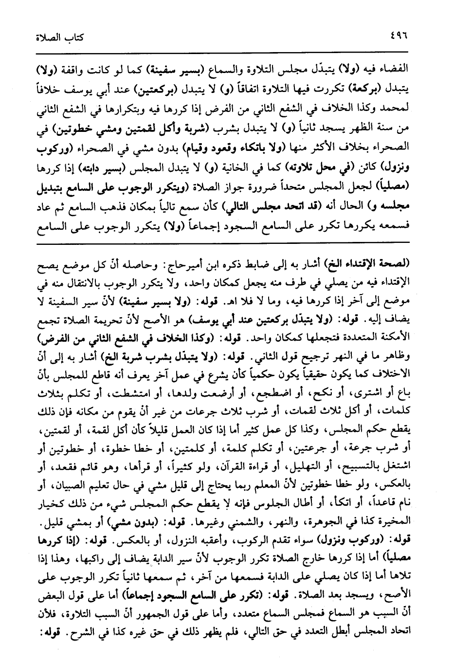 الفضاء فيه "ولا" يتبدل مجلس التلاوة والسماع "بسير سفينة" كما لو كانت واقفة "ولا" يتبدل "بركعة" تكررت فيها التلاوة اتفاقا "و" لا يتبدل "بركعتين" عند أبي يوسف خلافا لمحمد وكذا الخلاف في الشفع الثاني من الفرض إذا كررها فيه وبتكرارها في الشفع الثاني من سنة الظهر يسجد ثانيا "و" لا يتبدل بشرب "شربة وأكل لقمتين ومشي خطوتين" في الصحراء بخلاف الأكثر منها "ولا باتكاء وقعود وقيام" بدون مشي في الصحراء "وركوب ونزول" كائن "في محل تلاوته" كما في الخانية "ولا" يتبدل المجلس "بسير دابته" إذا كررها "مصليا" لجعل المجلس متحدا ضرورة جواز الصلاة "ويتكرر الوجوب على السامع بتبديل مجلسه و" الحال أنه "قد اتحد مجلس التالي" كأن سمع تاليا بمكان فذهب السامع ثم عاد فسمعه يكررها تكرر على السامع السجود إجماعا و "لا" يتكرر الوجوب على السامع