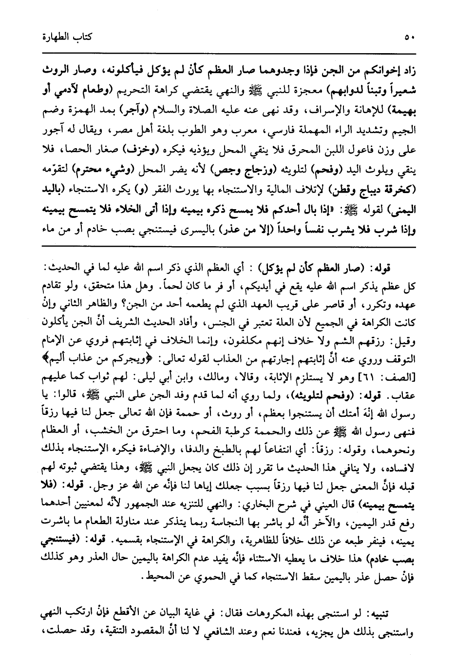 زاد إخوانكم من الجن" فإذا وجدوهما صار العظم كأن لم يؤكل فيأكلونه وصار الروث شعيرا وتبنا لدوابهم معجزة للنبي صلى الله عليه وسلم والنهي يقتضي التحريم "وطعام لآدمي أو بهيمة" للإهانة والإسراف وقد نهى عنه عليه الصلاة والسلام "وآجر" بمد الهمزة وضم الجيم وتشديد الراء المهملة فارسي معرب وهو الطوب بلغة أهل مصر ويقال له آجور على وزن فاعول - اللبن المحرق - فلا ينقي المحل ويؤذيه فيكره "وخزف" صغار الحصى فلا ينقي ويلوث اليد "وفحم" لتلويثه "وزجاج وجص" لأنه يضر المحل "وشيء محترم" لتقومه "كخرقه ديباج وقطن" لإتلاف المالية والاستنجاء بها يورث الفقر "و" يكره الاستنجاء "باليد اليمنى" لقوله صلى الله عليه وسلم: "إذا بال أحدكم فلا يمسح بيمينه وإذا شرب فلا يشرب نفسا واحدا" "إلا من عذر" باليسرى فيستنجي بصب خادم أو من ماء